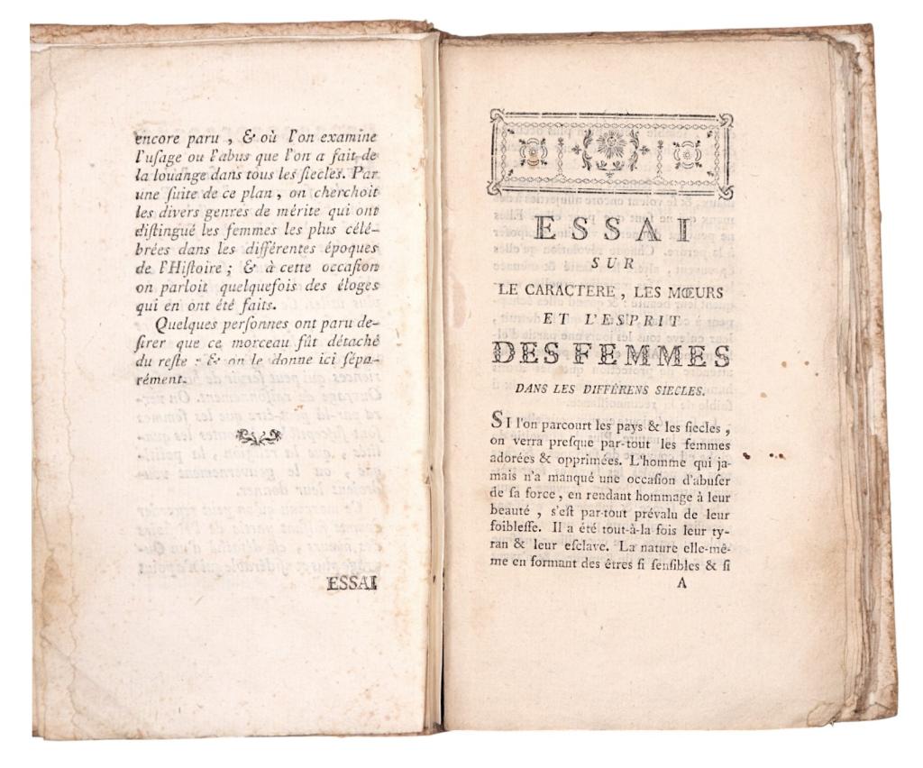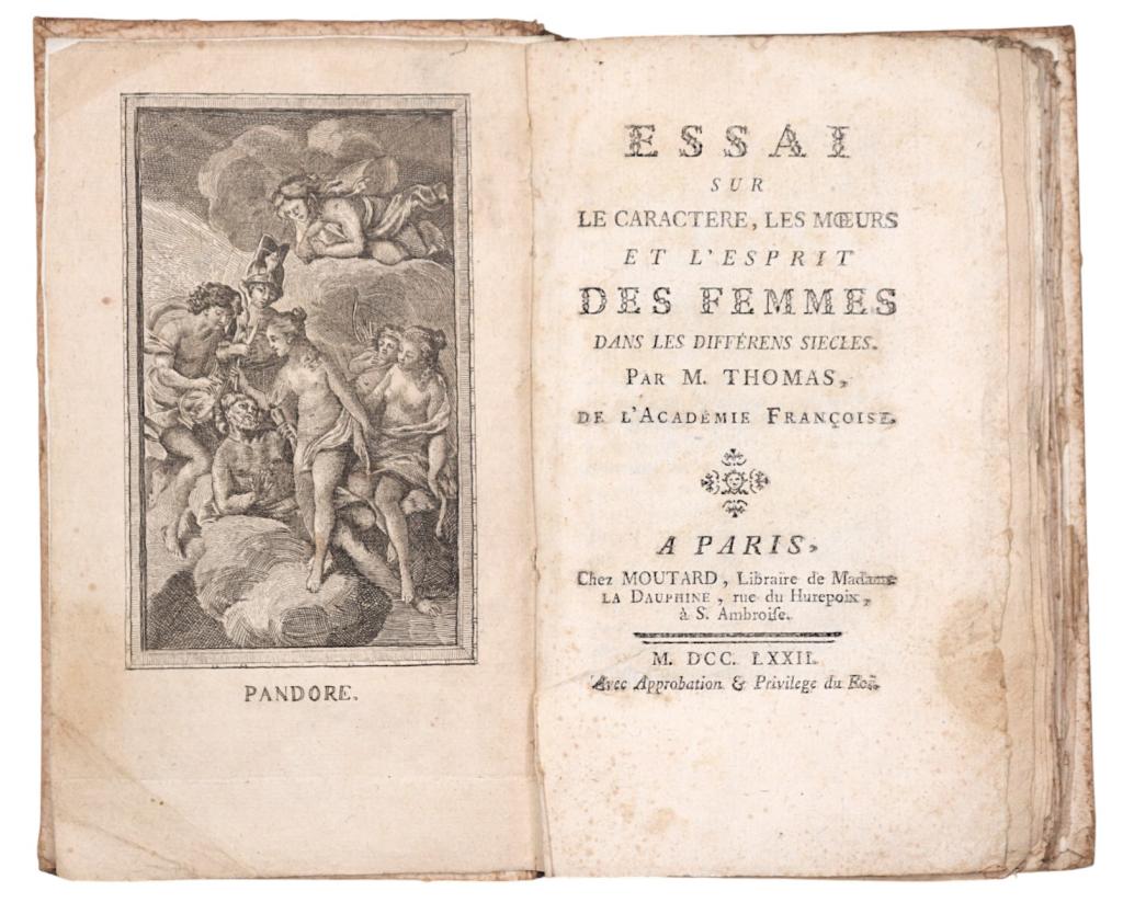Elegante edizione settecentesca del celebre Essai sur le caractère, les moeurs et l’esprit des femmes dans les différens siècles, opera anonima dedicata all’analisi della condizione femminile attraverso epoche e culture diverse. Antiporta inciso che raffigura Pandora, secondo il modello di Cochin, a sottolineare il carattere allegorico e morale dell’opera.