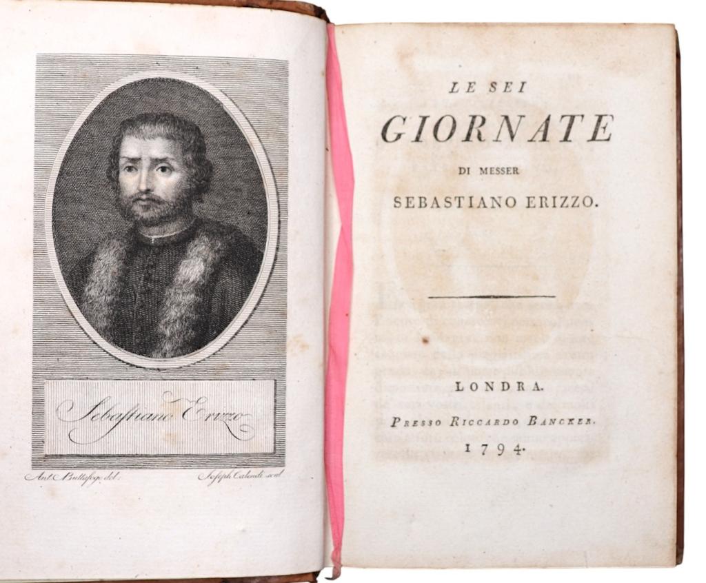 Elegante e rara edizione tardo-settecentesca del celebre testo narrativo di Sebastiano Erizzo (1525–1585), umanista e letterato veneziano, conosciuto anche come numismatico e filosofo.