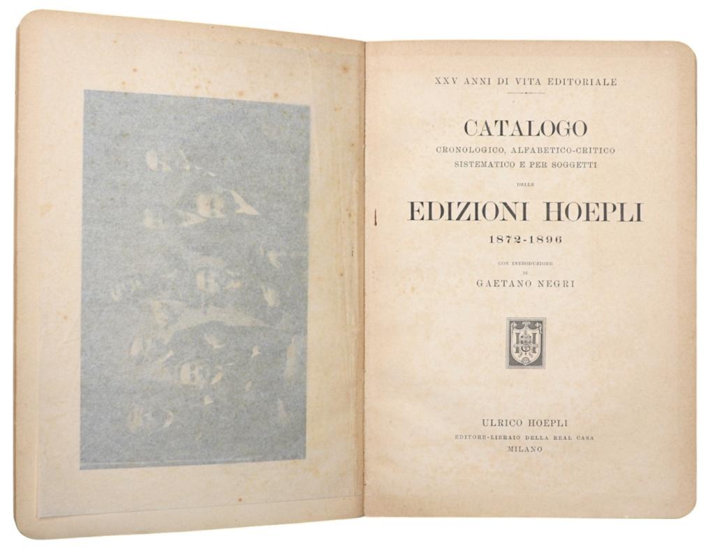 Raro catalogo editoriale ufficiale della celebre casa editrice Ulrico Hoepli, pubblicato in occasione dei suoi primi 35 anni di attività.