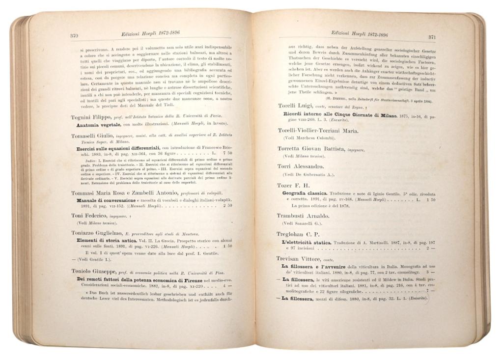 Strumento prezioso per bibliofili, librai antiquari, studiosi e collezionisti, permette di ricostruire l’evoluzione del catalogo Hoepli, con particolare attenzione ai manuali tecnici, scientifici e linguistici che resero celebre la casa milanese in Italia e all’estero.
