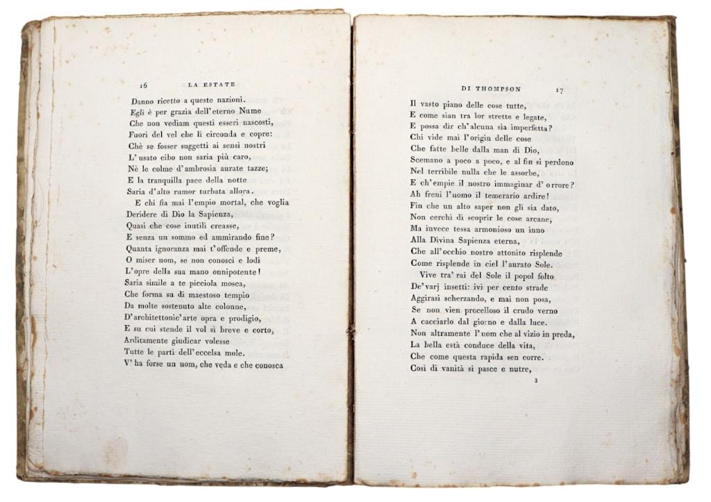 Rara edizione modenese del poema “La Estate”, traduzione italiana della celebre Summer di James Thomson (1700–1748), poeta scozzese autore del ciclo The Seasons, tra i capolavori della poesia naturalistica del XVIII secolo.