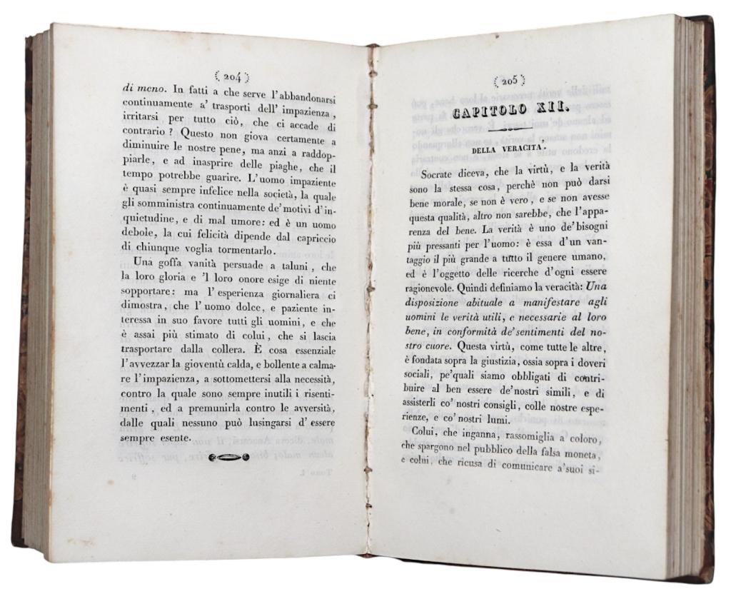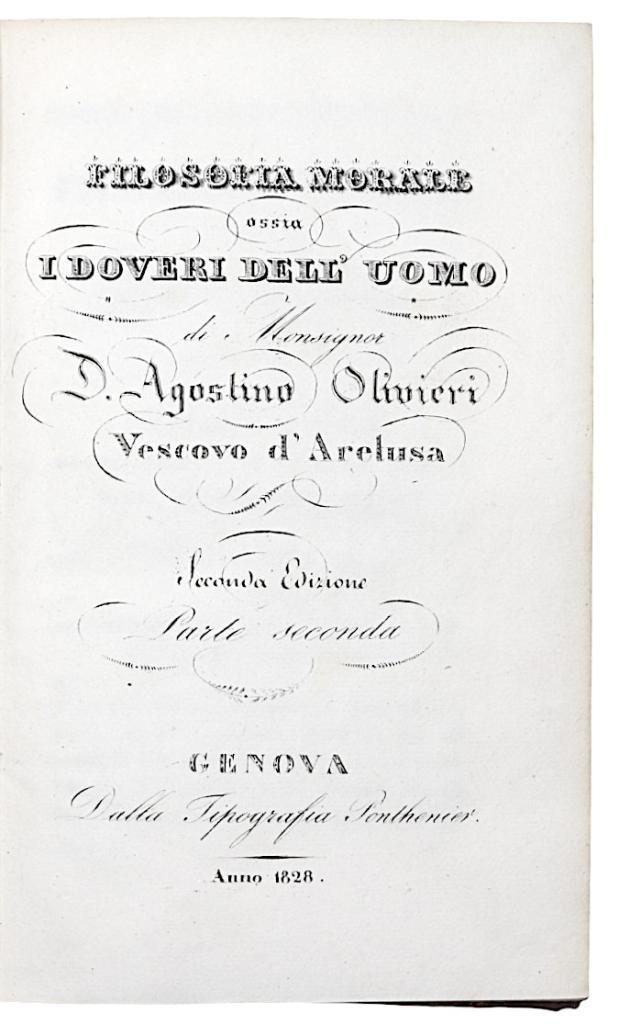 Seconda edizione (Genova, 1828) della Filosofia morale, ossia I doveri dell’uomo di Agostino Olivieri (1758-1834), vescovo d’Aretusa, che affronta in modo organico i principi della morale cristiana e naturale, proponendoli come fondamento etico per la vita religiosa e civile.