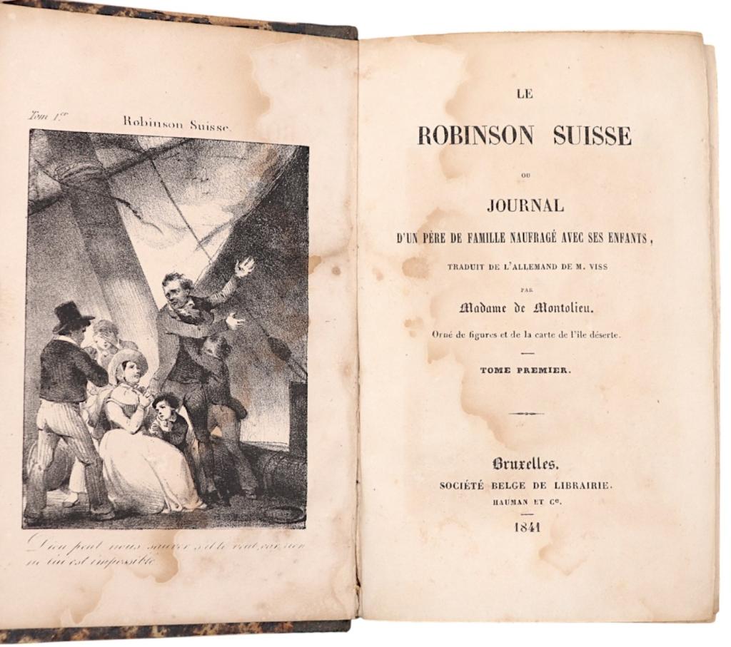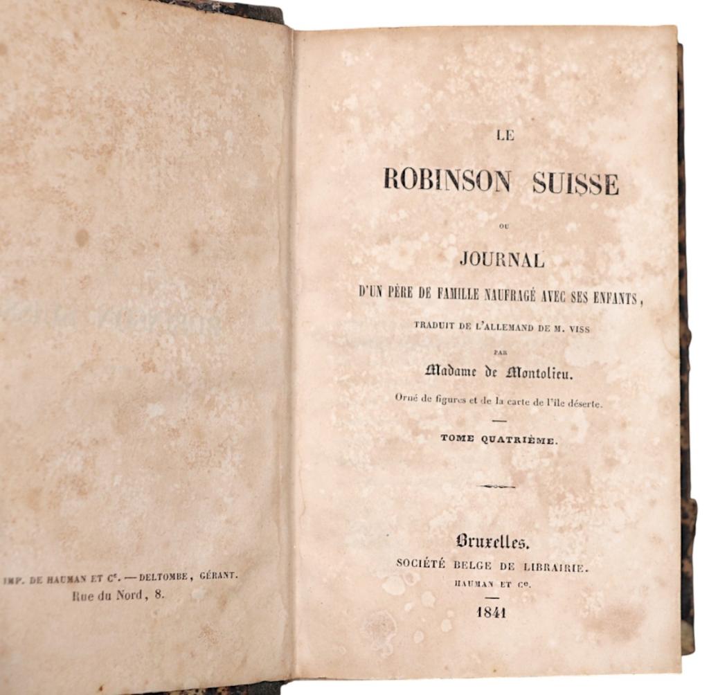 Bella e rara edizione belga del celebre romanzo d’avventura Le Robinson Suisse, versione francese del Der Schweizerische Robinson di Johann Rudolf Wyss (1782–1830), tradotta e adattata da Isabelle de Montolieu, che rese l’opera popolare in tutta Europa.