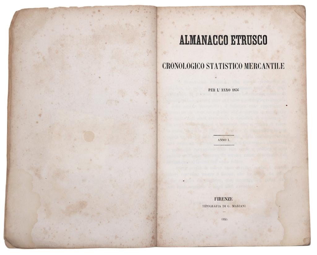 Prima annata (1856) dell’Almanacco etrusco, pubblicato a Firenze da G. Mariani, pensato come repertorio di informazioni cronologiche, statistiche e mercantili destinate a professionisti, commercianti e studiosi.