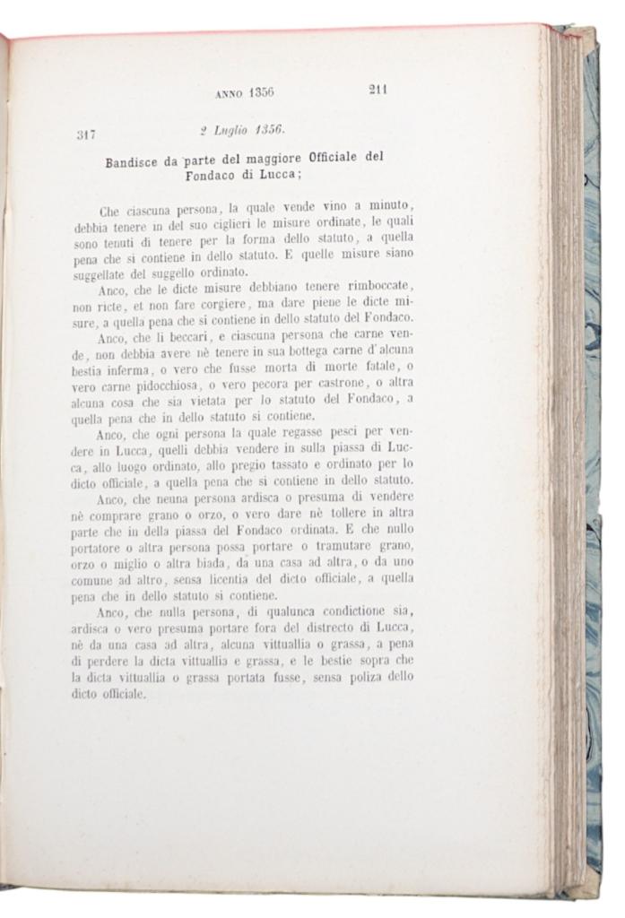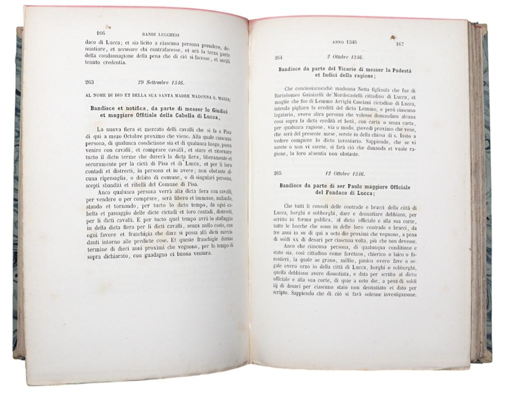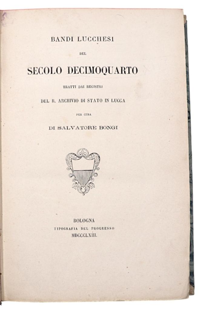 Importante edizione ottocentesca che raccoglie e pubblica per la prima volta una serie di bandi e documenti ufficiali lucchesi del XIV secolo, trascritti e annotati dal celebre archivista e studioso Salvatore Bongi (1825–1899), figura di spicco della storiografia toscana e direttore dell’Archivio di Stato di Lucca.
