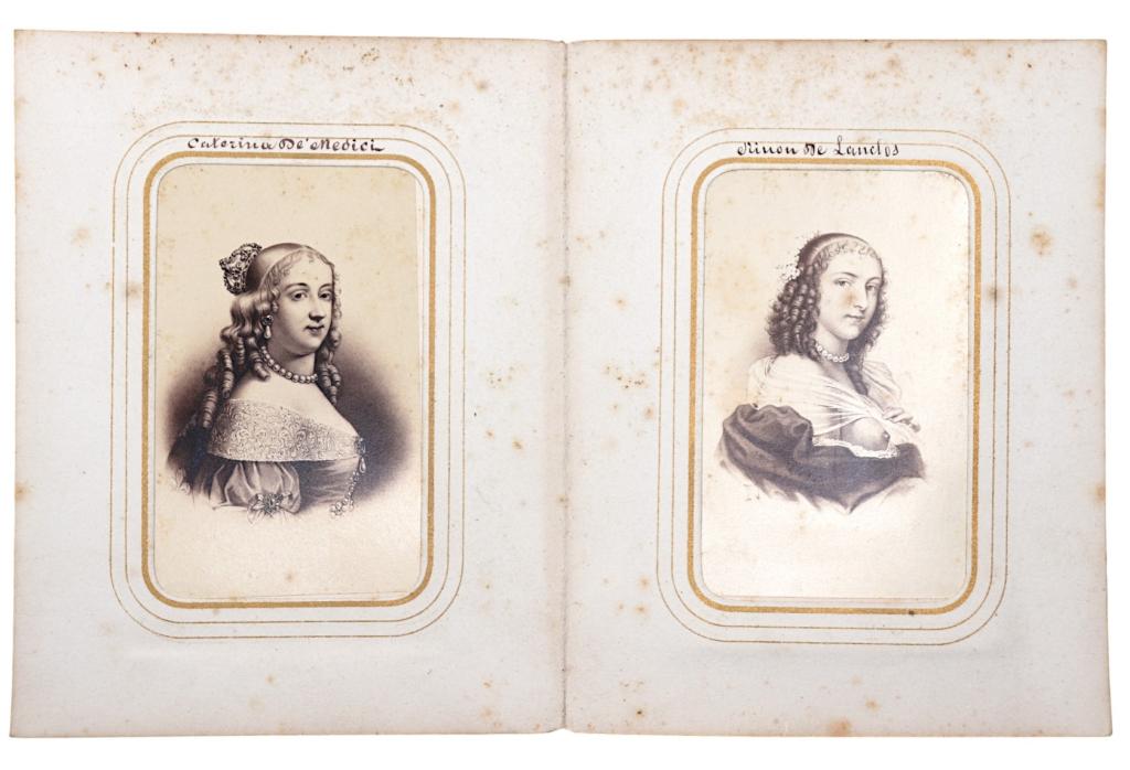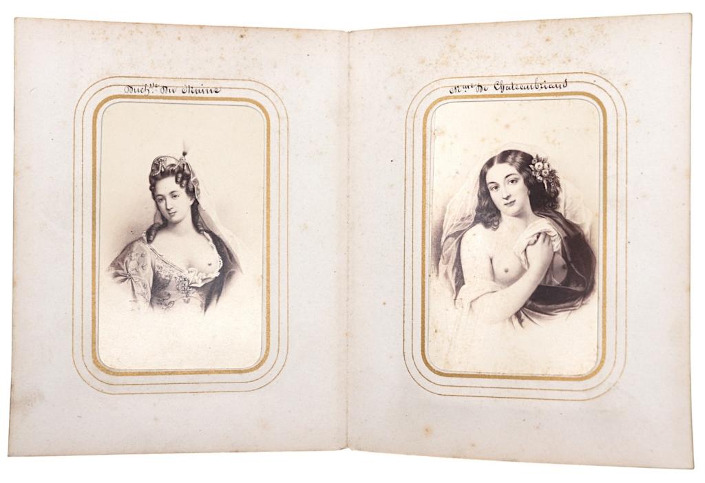 Accanto a queste, l’album presenta anche ritratti non osé di Regine e Principesse di Francia – tra cui Maria de’ Medici, Maria Antonietta, la Duchessa di Maine e altre dame di corte – rappresentate in modo decoroso e puramente rievocativo, come figure storiche o allegoriche.
