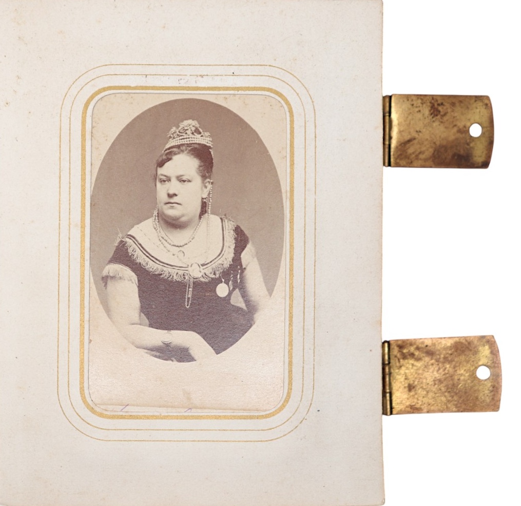 La legatura è un autentico capolavoro artigianale: pelle bordeaux con applicazioni e fermagli in ottone finemente cesellato, decorazioni in rilievo neogotiche e dorso modellato a motivi floreali. Le fotografie sono incorniciate da bordi dorati e accompagnate da didascalie manoscritte in francese che ne identificano i soggetti (“Duchesse de Chartres”, “M.me de Chateaubriand”, “Duchesse de Lancaster”, ecc.).
