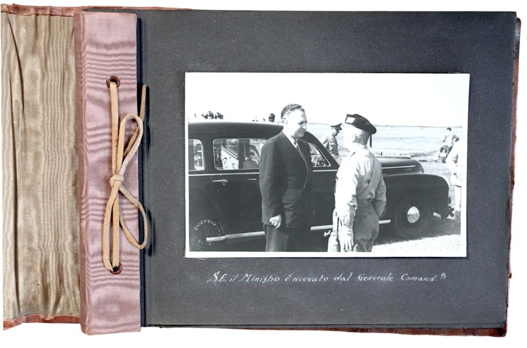 Raffinato album fotografico rilegato in pelle pregiata con dettagli dorati, datato 25 luglio 1949, composto da 20 fotografie originali di grande interesse storico e militare.