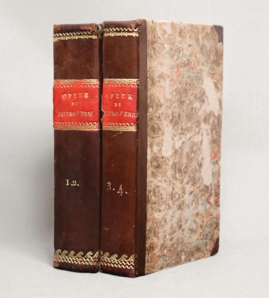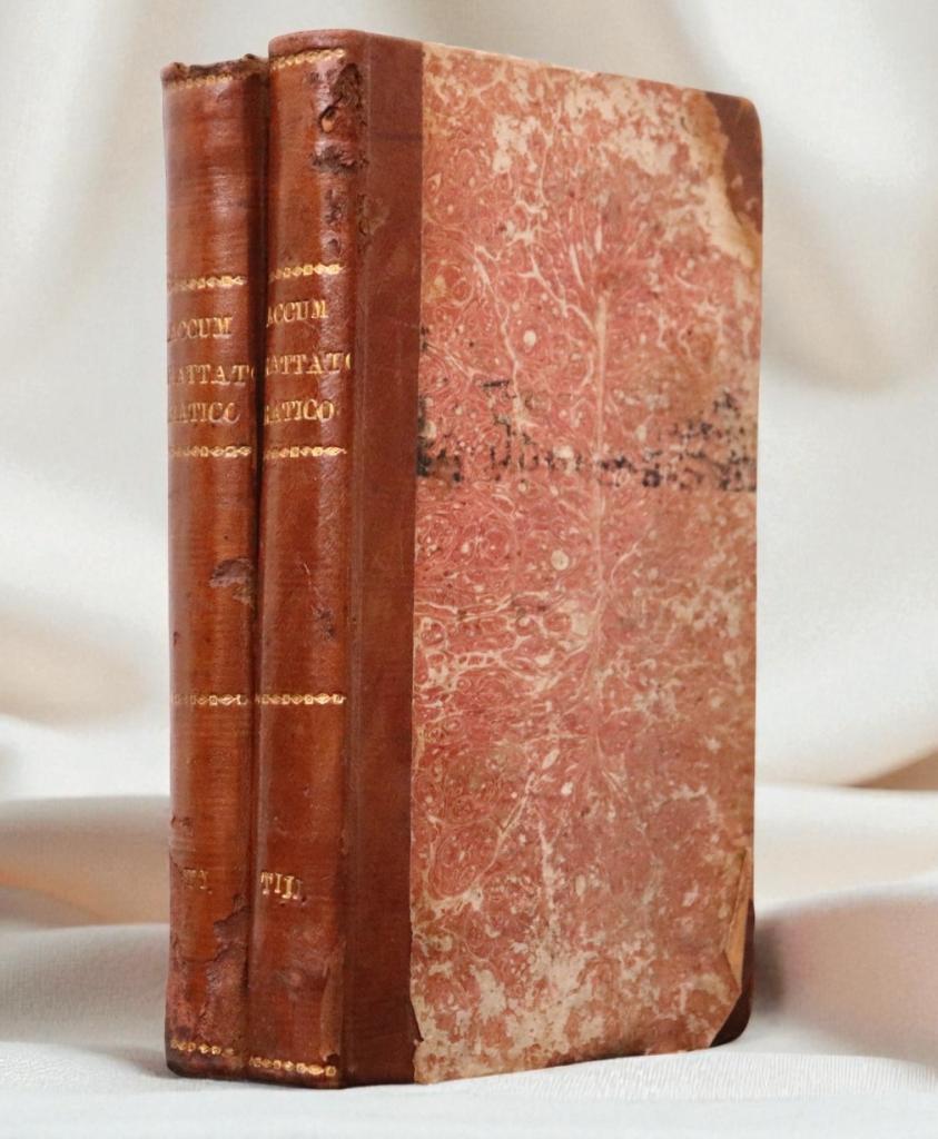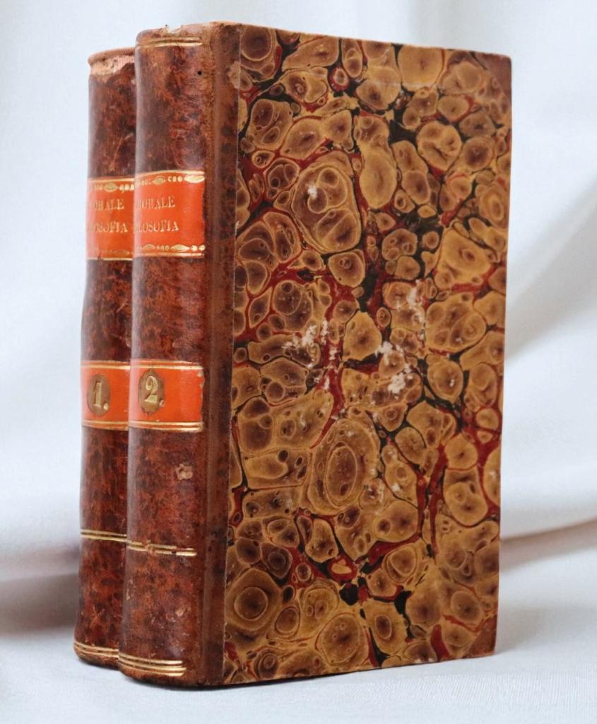 Olivieri, Filosofia morale ossia I doveri dell’uomo, Genova 1828, 2 voll. seconda edizione Titolo: Filosofia morale, ossia I doveri dell’uomo Seconda edizione (Genova, 1828) della Filosofia morale, ossia I doveri dell’uomo di Agostino Olivieri (1758-1834), vescovo d’Aretusa, che affronta in modo organico i principi della morale cristiana e naturale, proponendoli come fondamento etico per la vita religiosa e civile. Il primo volume, con frontespizio arricchito da un ritratto inciso dell’autore, comprende le introduzioni e il corpo principale dell’opera, distribuito in oltre 360 pagine. Il secondo volume, di quasi 400 pagine, prosegue con il trattato completo dei doveri, offrendo un’esposizione sistematica e di taglio pedagogico. La tipografia Ponthenier curò l’edizione con eleganza sobria, caratterizzata dall’uso di caratteri corsivi e romani e da fregi xilografici decorativi.