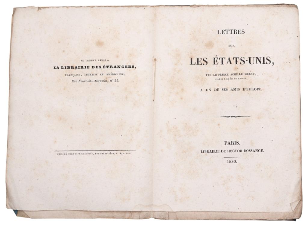 Lettres sur les États-Unis, par le prince Achille Murat fils de l'ex Roi de Naples à un de ses amis d’Europe. Titolo: Lettres sur les États-Unis, par le prince Achille Murat fils de l'ex Roi de Naples à un de ses amis d’Europe Rara edizione parigina del 1830 delle Lettres sur les États-Unis di Achille Murat (1801-1847), figlio di Gioacchino Murat e Carolina Bonaparte, nipote di Napoleone. Esule negli Stati Uniti dopo la caduta del regno di Napoli, Achille Murat si stabilì in Florida e divenne cittadino americano, partecipando attivamente alla vita politica locale. In queste lettere, indirizzate a un amico europeo, Murat descrive la società, le istituzioni e i costumi degli Stati Uniti dell’epoca, offrendo uno dei più vividi resoconti europei dell’America post-indipendenza. L’opera, coniuga osservazione politica, curiosità antropologica e riflessione filosofica, restituendo uno sguardo critico e partecipe sulla giovane democrazia americana. Di particolare interesse storico, il testo è una testimonianza preziosa della percezione europea degli Stati Uniti nella prima metà dell’Ottocento, scritta da un protagonista diretto della diaspora napoleonica.