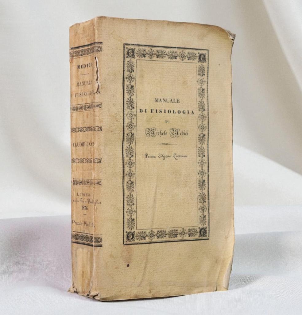 Libro manuale di fisiologia di Michele Medici, Livorno 1836, prima edizione livornese rara Titolo: Manuale di fisiologia Prima edizione livornese (1836) del Manuale di fisiologia di Michele Medici (1782-1859), medico e docente bolognese che fu tra i principali esponenti della scienza fisiologica italiana dell’Ottocento. L’opera, basata sulla seconda edizione bolognese, viene qui arricchita da ulteriori opuscoli dello stesso autore, ampliando il quadro delle conoscenze sull’anatomia e le funzioni del corpo umano. Il manuale, si caratterizza per un’impostazione sistematica e didattica, destinata tanto all’uso accademico quanto alla pratica medica. Rappresenta una testimonianza significativa dello stato della ricerca fisiologica italiana nella prima metà del XIX secolo, quando la disciplina si stava affermando come scienza autonoma tra anatomia e medicina clinica. Stampato dalla Tipografia Tesi e Wambergher, il volume si distingue per chiarezza tipografica e formato maneggevole (19 cm), tipico dei manuali universitari dell’epoca.