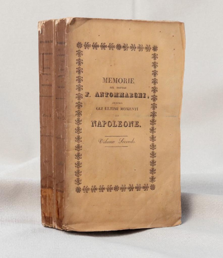 Memorie del Dottor Antommarchi ovvero Gli ultimi momenti di Napoleone, Lugano 1827, 2 voll. Titolo: Memorie del dottore F. Antommarchi, ovvero Gli ultimi momenti di Napoleone Prima edizione italiana delle celebri Memorie di Francesco Antommarchi (1780-1838), medico corso e ultimo dottore personale di Napoleone Bonaparte a Sant’Elena. L’opera, pubblicata a Lugano nel 1827, è qui conservata completa in due volumi di medio formato (20 cm), rispettivamente di 267 e 273 pagine. Il testo, dettagliato e ricco di osservazioni cliniche e personali, narra gli ultimi anni dell’Imperatore, le sue condizioni di salute, i rapporti con il seguito e i pensieri estremi. Queste memorie ebbero vasta diffusione europea e contribuirono a consolidare il mito napoleonico come eroe caduto.