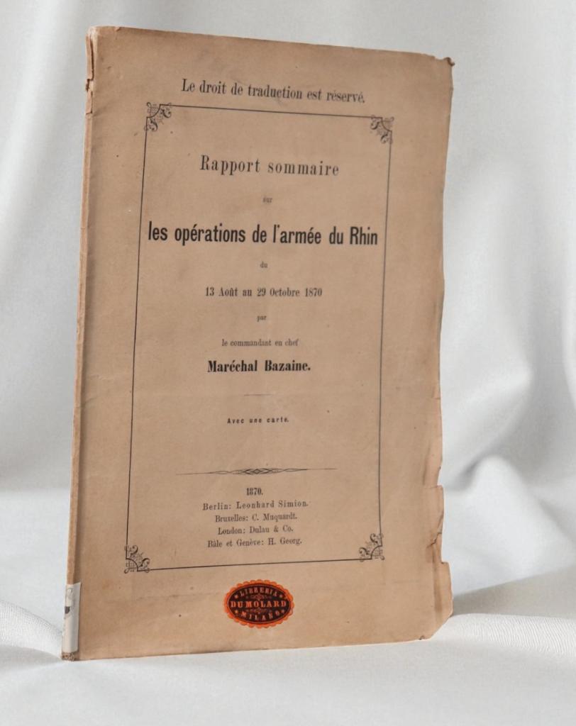 Rapport sommaire sur les opérations de l'armée du Rhin du 13 Août au 29 Octobre 1870 Editore: Berlino, Bruxelles, Londra, Basilea e Ginevra, Leonhard Simion, C. Muquardt, Dulau & Co, H. Georg Raro opuscolo in brossura originale, con carta geografica ripiegata in frontespizio raffigurante «Metz et Environs. Indiquant les Positions de l’Armée du Rhin dans le camp retranché». Interessante testimonianza della guerra franco-prussiana (1870-71), dedicata alle operazioni dell’Armata del Reno tra agosto e ottobre 1870, con preziosa cartografia d’epoca.