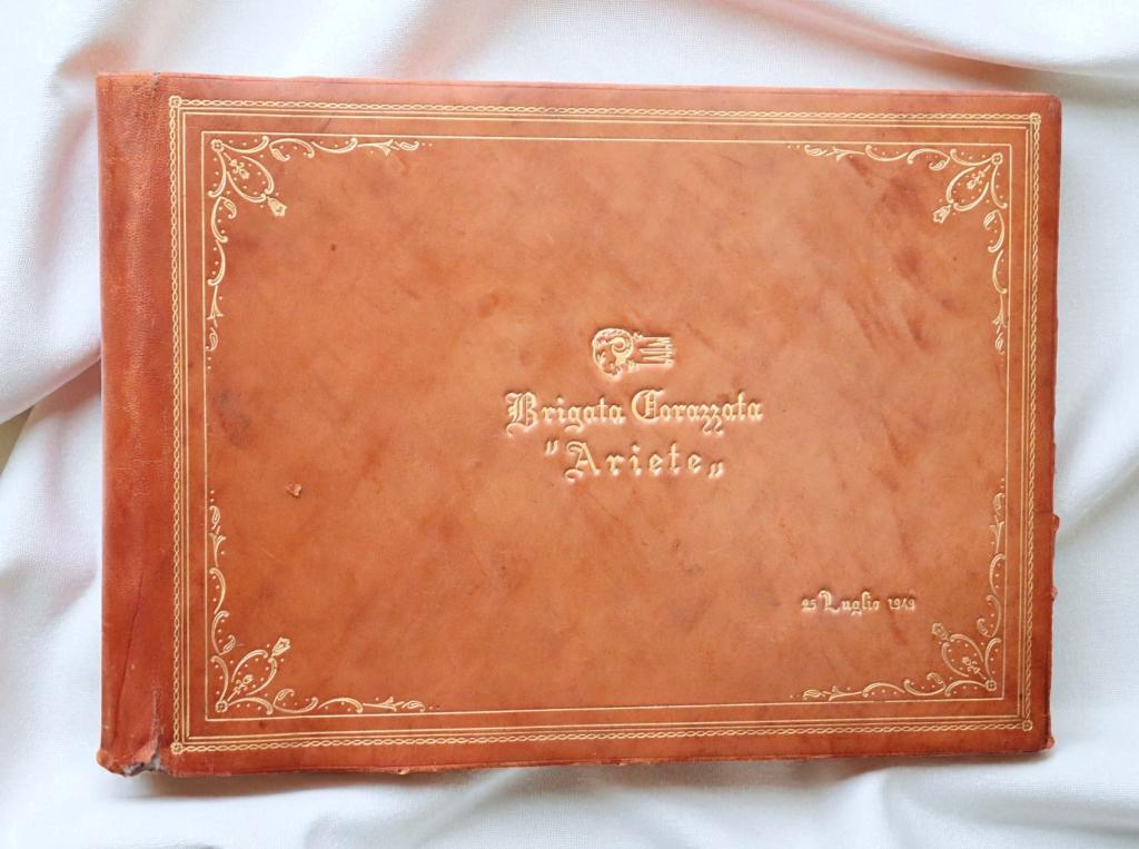 Raffinato album fotografico rilegato in pelle pregiata con dettagli dorati, datato 25 luglio 1949, composto da 20 fotografie originali di grande interesse storico e militare. Le fotografie ritraggono reparti di Alpini, carri armati, mezzi corazzati e artiglieria, in perfetta disposizione militare e in momenti di cerimonia ufficiale. Un documento di raro valore collezionistico, elegante nella presentazione e denso di significato storico, che racconta la fierezza, l’ordine e il prestigio della Brigata Ariete nel cuore dell’Italia del dopoguerra.