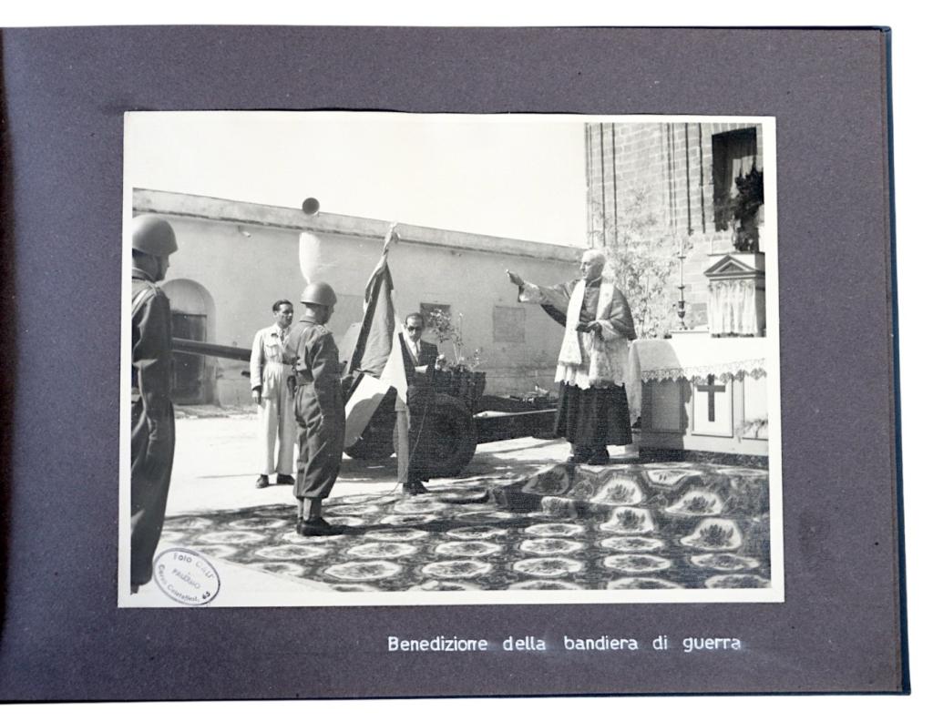 Prestigioso album fotografico d’epoca, composto da 20 fotografie originali che documentano con grande intensità la cerimonia militare del 25 luglio 1949 dedicata al 22° Reggimento Artiglieria “Aosta”. Le immagini, realizzate dallo Studio Foto Cali di Palermo, ritraggono scene solenni di benedizione della bandiera di guerra, l’intero reggimento schierato per gli onori, e la consegna della Medaglia d’Oro al Valor Militare alla memoria del Sottotenente Andrea Solé. Completano la raccolta splendide immagini del passaggio in parata dei reparti, dei mezzi corazzati e dell’artiglieria, testimonianza del rinnovato orgoglio nazionale e della modernizzazione delle forze armate italiane nel primo dopoguerra.