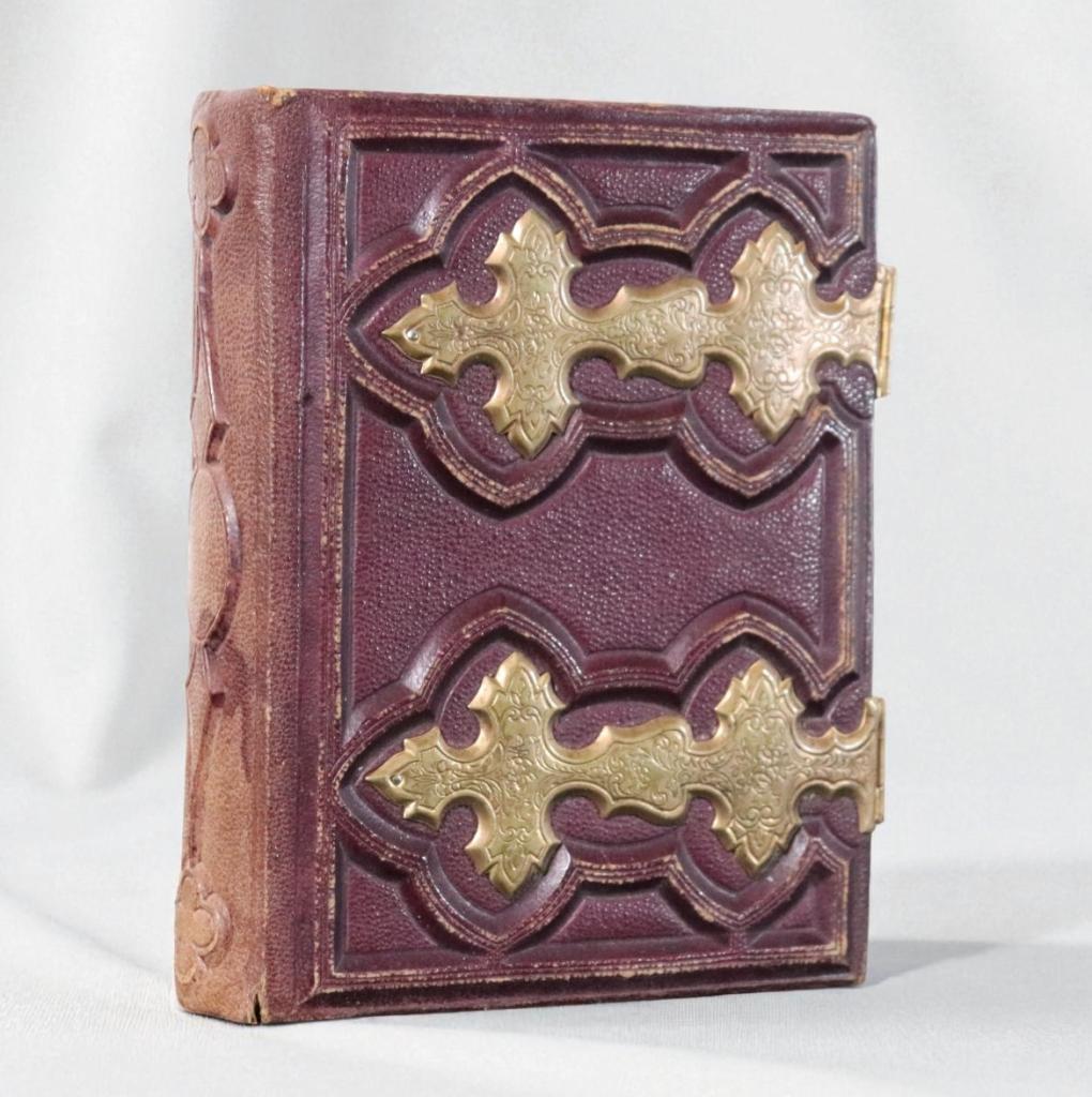 Raro e affascinante album fotografico ottocentesco, composto da 31 fotografie cabinet originali di grande fascino e pregio collezionistico. Le immagini più osé, di tono elegante e sensuale, raffigurano dame, attrici e nobildonne idealizzate in pose raffinate e teatrali, simbolo di un erotismo discreto e sofisticato, lontano dalla volgarità. La legatura è un autentico capolavoro artigianale: pelle bordeaux con applicazioni e fermagli in ottone finemente cesellato, decorazioni in rilievo neogotiche e dorso modellato a motivi floreali. Le fotografie sono incorniciate da bordi dorati e accompagnate da didascalie manoscritte in francese che ne identificano i soggetti (“Duchesse de Chartres”, “M.me de Chateaubriand”, “Duchesse de Lancaster”, ecc.). Un volume di straordinario fascino estetico e storico, raro esempio di collezione privata ottocentesca in cui arte, sensualità e memoria nobiliare convivono armoniosamente.