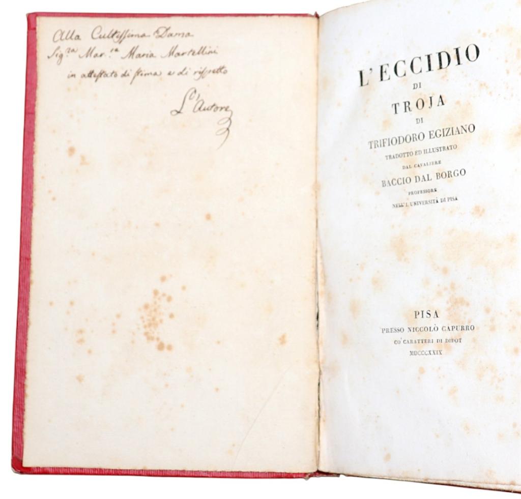 Dalle prime edizioni e testi rari dell’età napoleonica — trattati di chimica, codici giuridici, opere di Scott, Verri, Manzoni, D’Azeglio — alle testimonianze del Risorgimento e della scienza ottocentesca, con titoli di filosofia, massoneria, botanica, archeologia e storia naturale.