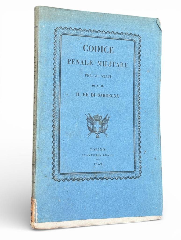 Codice penale militare per gli Stati di S. M. il Re di Sardegna, edizione Stamperia Reale Torino 1859 Prima edizione di un codice normativo militare del Regno di Sardegna pubblicato dalla Stamperia Reale di Torino nel 1859. Il volume presenta il testo delle norme di diritto penale militare applicabili agli Stati di Sua Maestà il Re di Sardegna nell’ambito della giustizia e della disciplina militare, con disposizioni sulle pene e sui procedimenti per le infrazioni disciplinari e penali in tempo di pace e di guerra. L’opera è stampata in brossura editoriale con titolo e stemma sabaudo entro bordura litografica.