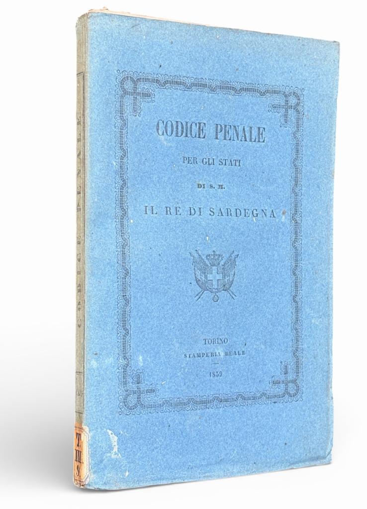 Codice penale per gli Stati di S. M. il Re di Sardegna, edizione Stamperia Reale Torino 1859 Edizione del 1859 del Codice penale per gli Stati di S. M. il Re di Sardegna, pubblicato dalla Stamperia Reale di Torino. Si tratta del testo normativo penale promulgato per il Regno di Sardegna in quell’anno, con disciplina delle norme penali applicabili all’interno degli Stati sabaudi prima dell’Unità d’Italia. Il codice raccoglie le disposizioni relative a delitti, pene e procedure penali vigenti nel regno sabaudo alla fine degli anni Cinquanta dell’Ottocento.