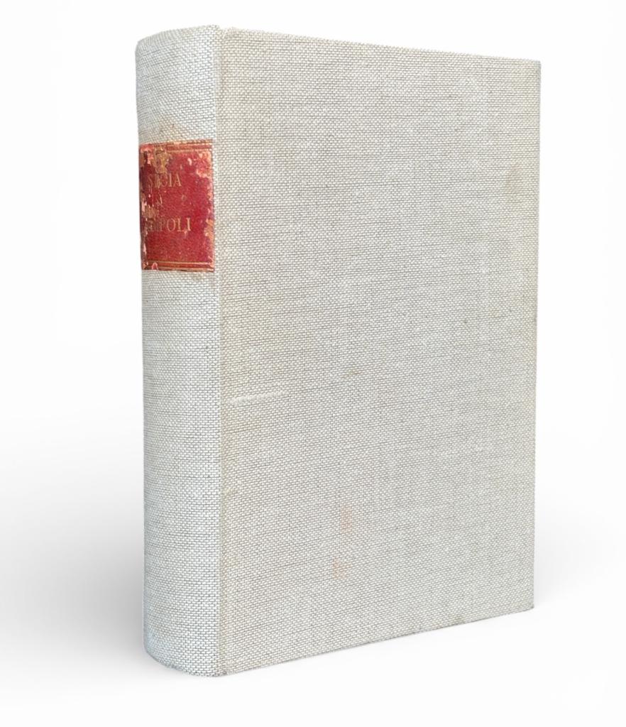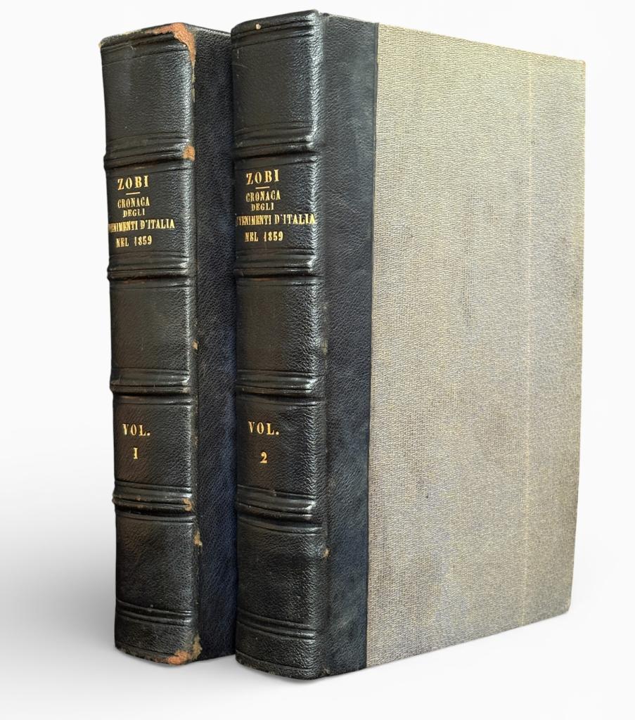 Cronaca degli avvenimenti d’Italia nel 1859, dettagliata cronaca della Seconda Guerra d’Indipendenza, edizione Grazzini Giannini e C. Firenze 1859 Prima edizione di una dettagliata cronaca degli avvenimenti italiani del 1859, presentata come testo “corredato di documenti per servire alla storia” e dedicata alla Seconda Guerra d’Indipendenza. L’opera, scritta da Antonio Zobi, si distingue per l’impostazione documentaria e per il taglio di racconto immediato dei fatti, con un’impronta dichiaratamente patriottica. Pubblicata a Firenze nel 1859, in due volumi, costituisce una testimonianza coeva di forte interesse storico per lo studio del Risorgimento e della narrazione contemporanea degli eventi politici e militari di quell’anno. Rilegatura in mezza pelle con nervi a vista e dorature sul dorso.