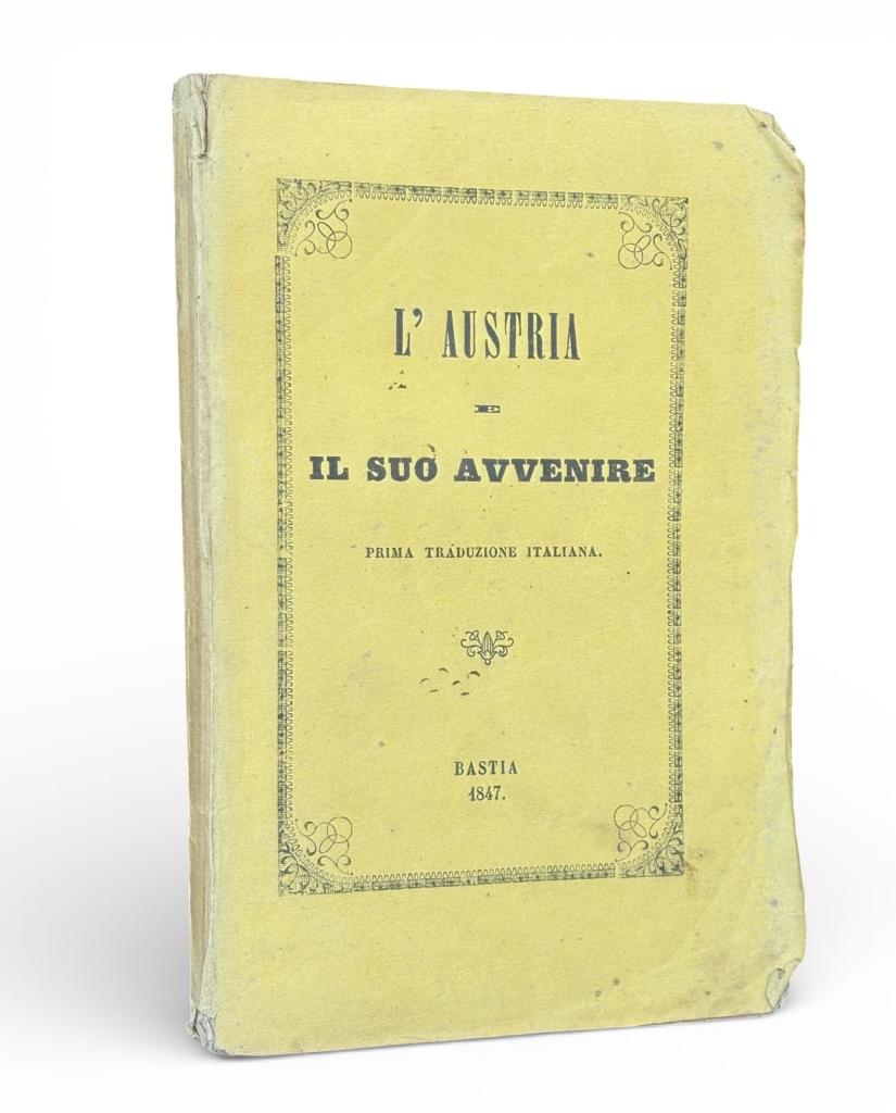 Titolo: L’Austria e il suo avvenire Testo composto in forma anonima e attribuito a Victor Franz Freiherr von Andrian-Werburg, pubblicato a Bastia nel 1847 senza indicazione di editore. Opera di taglio politico-prospettico che riflette sull’Impero austriaco e sulle sue possibili traiettorie future nel quadro delle tensioni europee della metà dell’Ottocento. Edizione in brossura con copertina ornata, di interesse per la storia delle idee e del dibattito politico pre-1848, legata alla riflessione riformatrice in area asburgica.