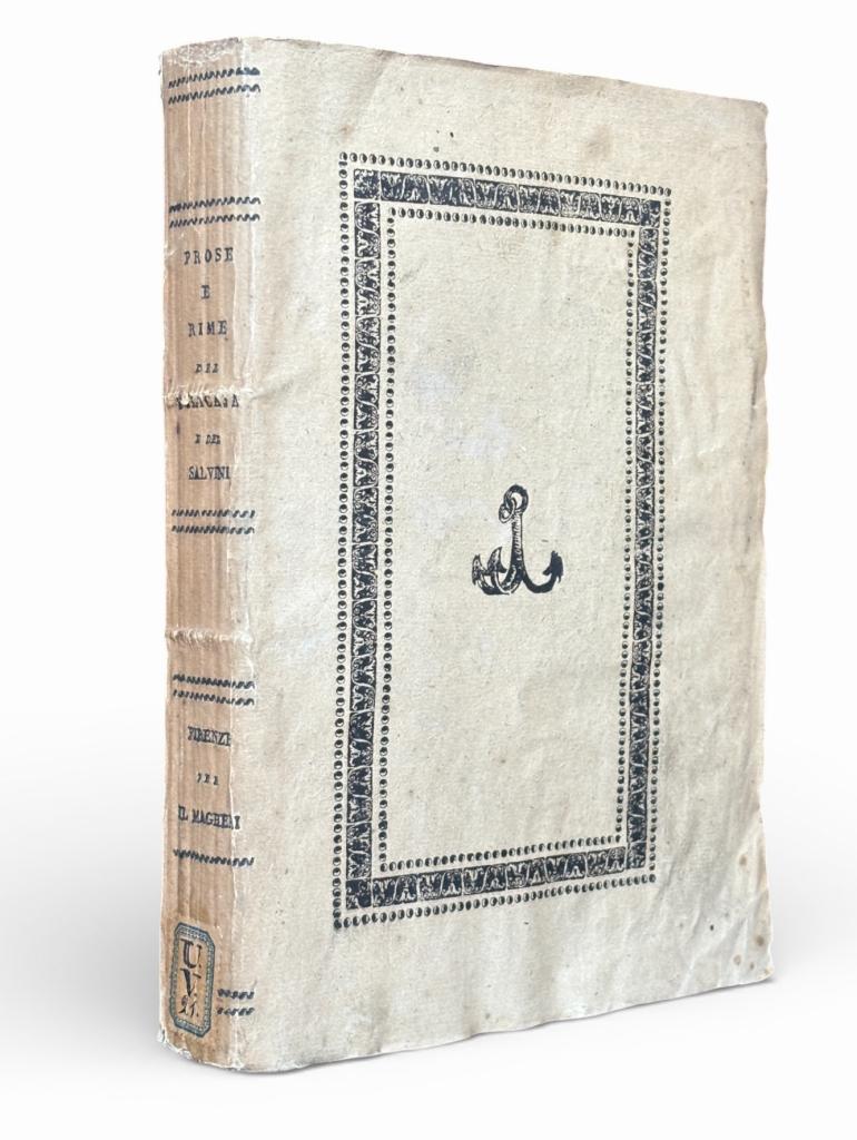 Prose e rime inedite del Sen. Vincenzio Filicaja, raccolta Magheri Firenze 1821 Titolo: Prose e rime inedite del Sen. Vincenzio Filicaja d’Anton Maria Salvini e d’altri Raccolta composta attorno alla figura di Vincenzio Filicaja e pubblicata a Firenze nel 1821 per il Magheri. Sotto il titolo è presente il frullone della Crusca. Il volume si presenta in brossura originale e la raccolta è indicata come dovuta al Can. Domenico Moreni, realizzata in occasione delle nozze Garzoni-Ginori Lisci. Opera di interesse letterario e bibliografico, in quanto riunisce componimenti dati per la prima volta alle stampe in questa edizione.
