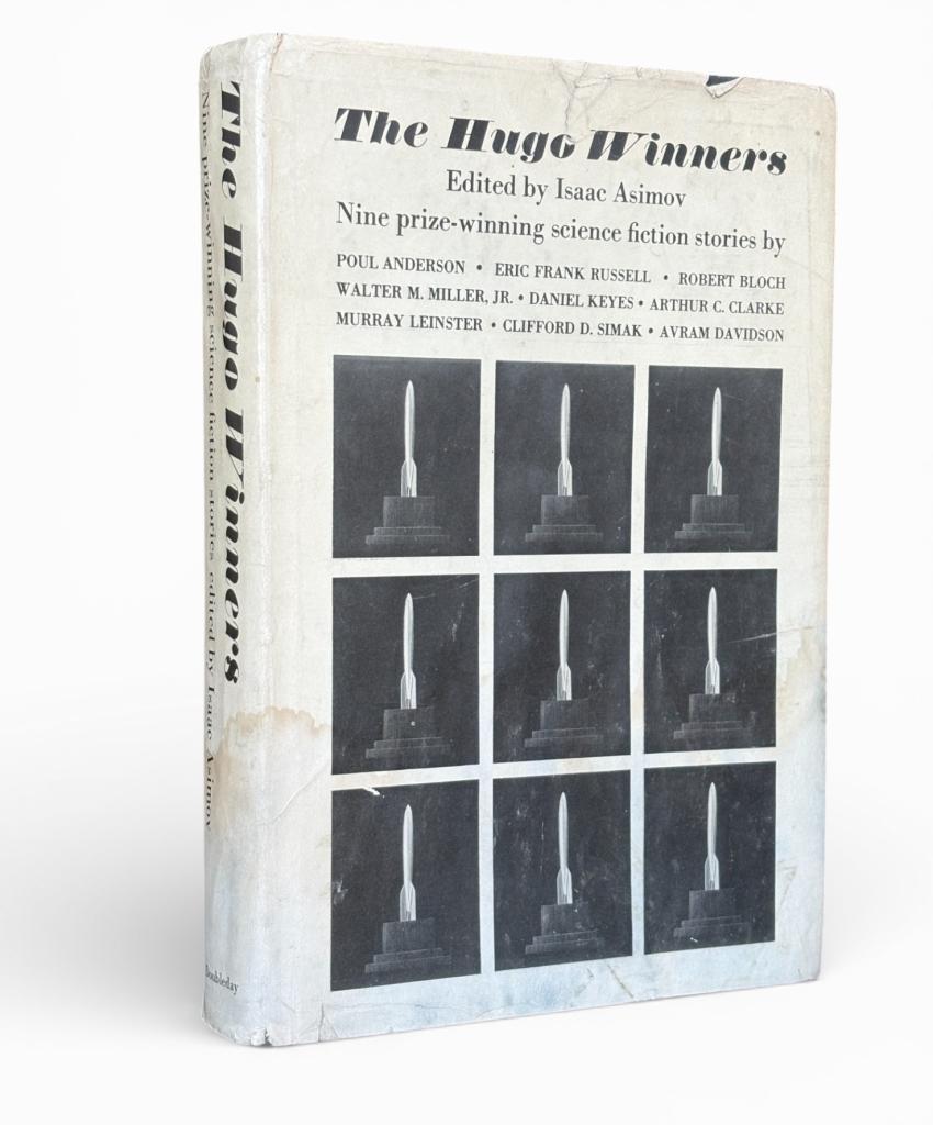 The Hugo Winners, prima edizione Doubleday 1962 - Isaac Asimov Titolo: The Hugo Winners Volume curato da Arthur C. Clarke e pubblicato da Doubleday nel 1962, in prima edizione dichiarata edita da Isaac Asimov. Raccolta legata al premio Hugo, con testi di narrativa fantascientifica premiata, comprendendo anche la prima apparizione in volume cartonata di Darfsteller di Walter M. Miller, Jr., The Longest Voyage di Poul Anderson e Flowers for Algernon di Daniel Keyes. Edizione in tela nera dell’editore con titoli argentati al dorso e sovraccoperta con prezzo originale stampato ($4.50) indicato come presente.