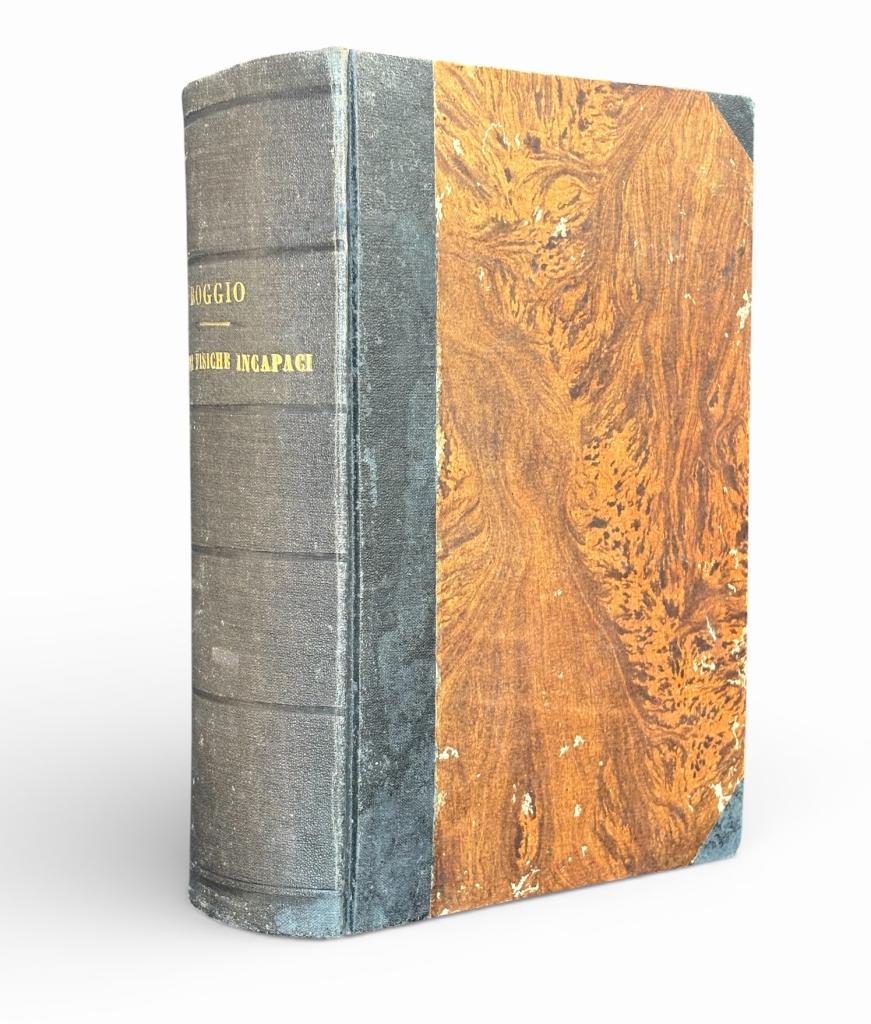 Delle persone fisiche incapaci agli atti civili e di commercio e delle forme abilitative nel diritto italiano. Studio teorico pratico (Torino, UTE, 1888-1889) Titolo: Delle persone fisiche incapaci agli atti civili e di commercio e delle forme abilitative nel diritto italiano. Studio teorico pratico Opera composta in forma di studio teorico-pratico sul diritto italiano, dedicata all’incapacità delle persone fisiche negli atti civili e di commercio e alle relative forme abilitative. Esemplare con rilegatura che racchiude entrambi i volumi in un solo tomo, in mezza tela con piatti marmorizzati marroni e titolo al dorso in oro. Testo in buone condizioni generali con leggere fioriture