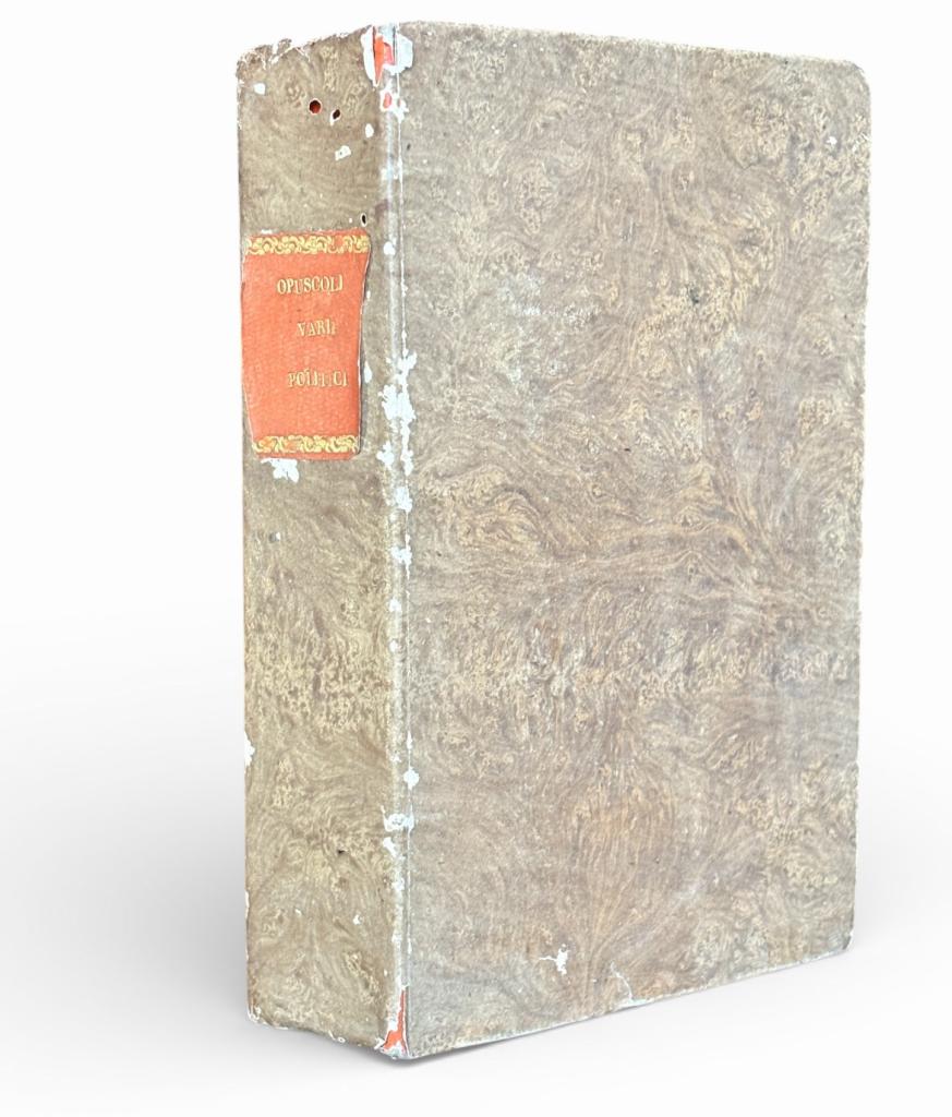 Raccolta di scritti e saggi (Cod: GULAST0226) L’opera, rilegata in carta marmorizzata coeva, raccoglie le seguenti opere: -Riforme del governo. Una parola ai sudditi del Papa -I miracoli della paura. Ragionamento -Sulla proporzione delle pene secondo la diversità de’ tempi. Epistola -La causa del diavolo e quella della verità al tribunale della Spagna e dell’Europa -Risposta dei redattori della Voce della Verità al libello intitolato “Discorso storico sulla vita di Ciro Menotti” -Un viaggetto nella luna Interessante raccolta.
