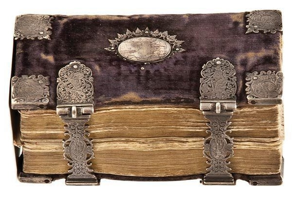 Legature in seta o velluto. Copertine tessili per edizioni di devozione o dono ufficiale; cromie vivaci, spesso con caulini metallici e applicazioni.