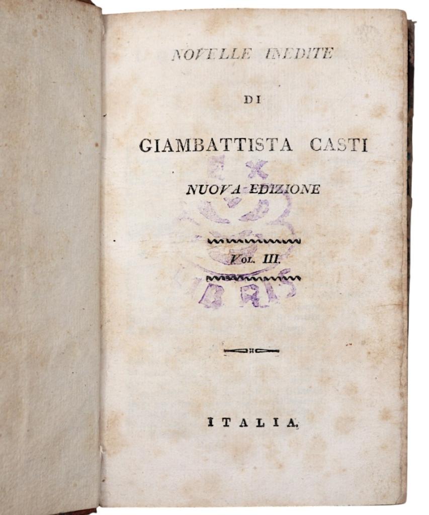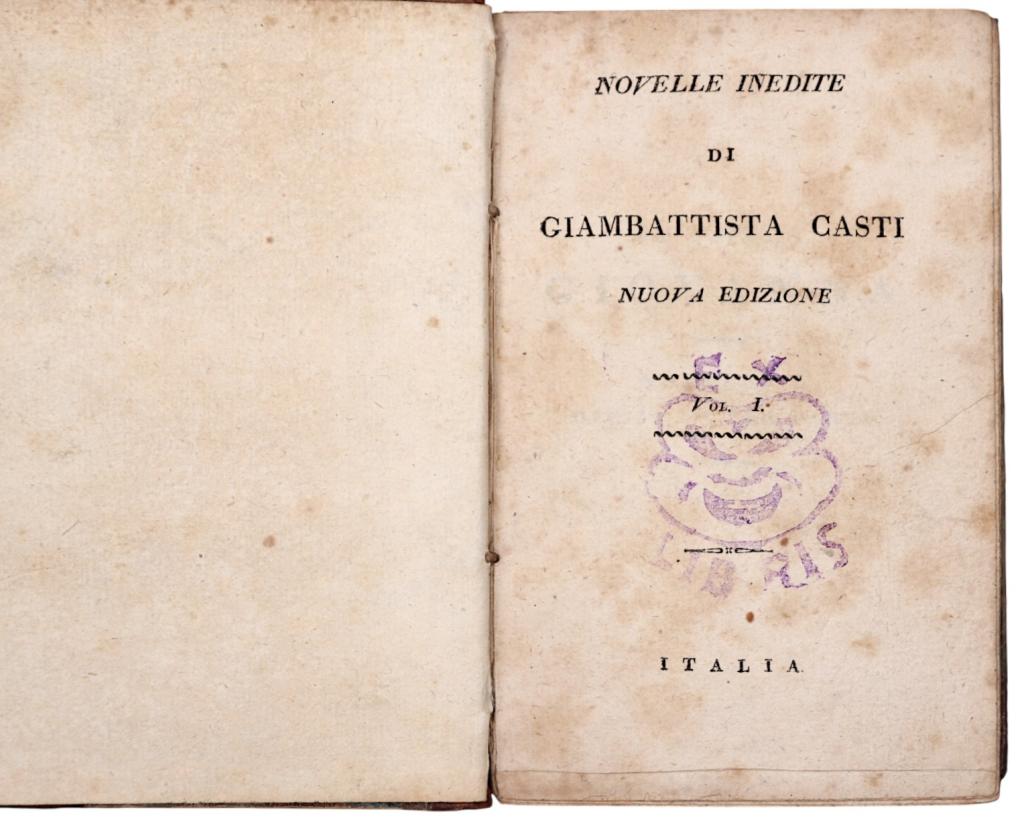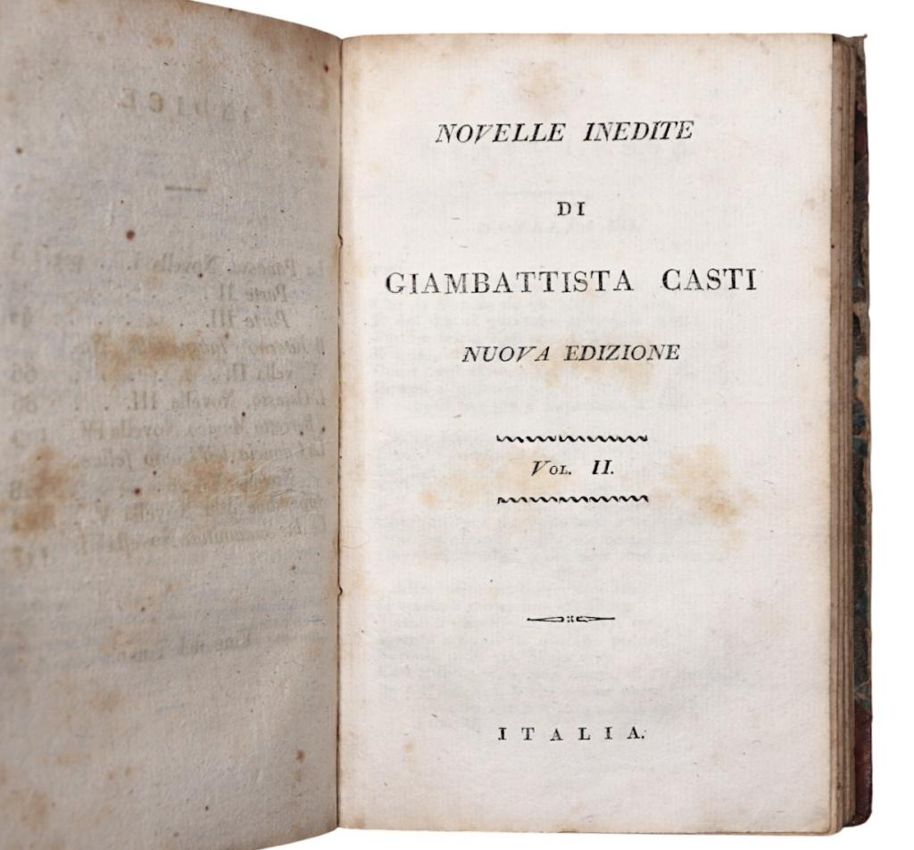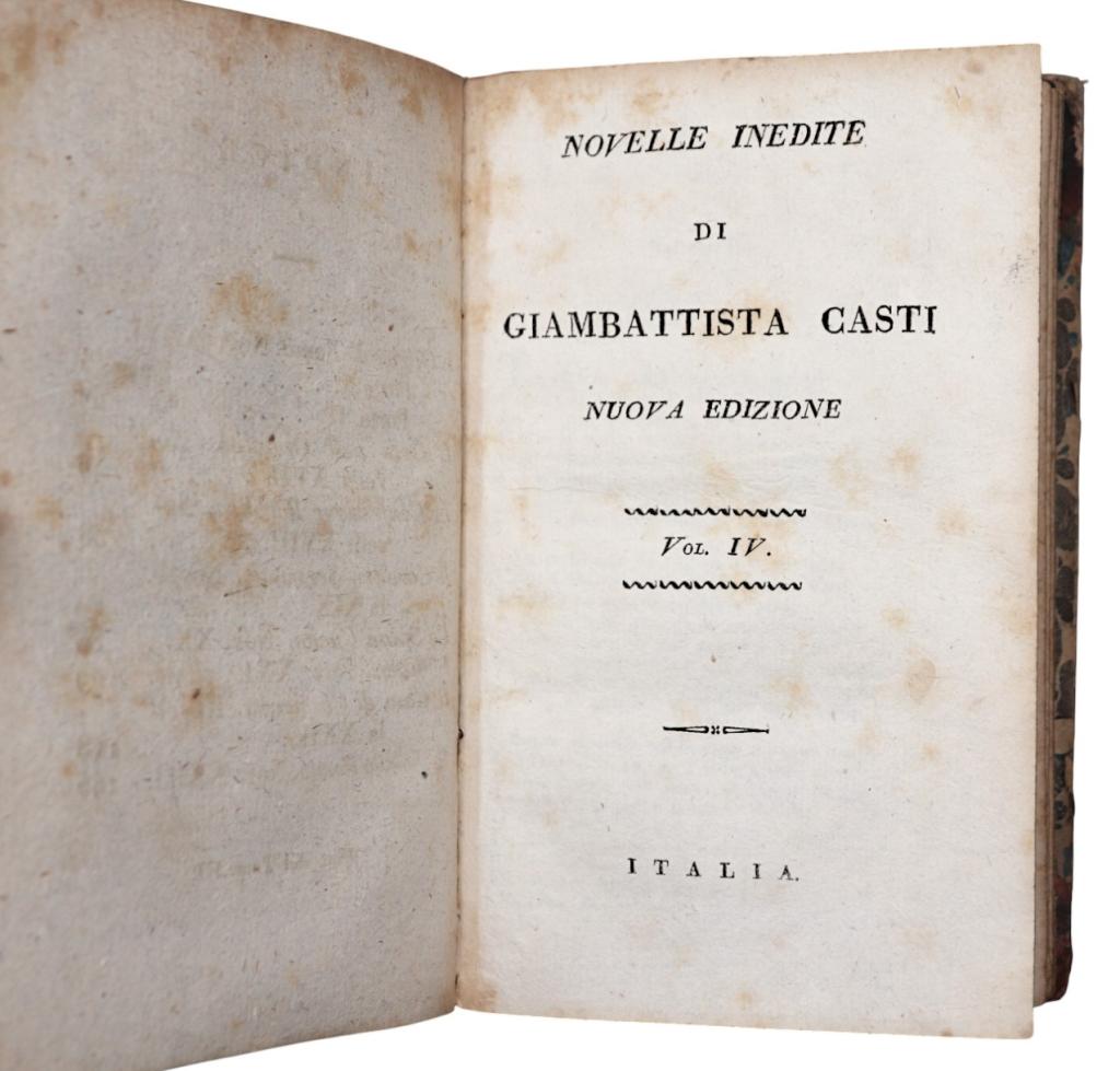 Rara edizione ottocentesca, anonima e di luogo fittizio (“Italia”), delle Novelle inedite di Giovanni Battista Casti (1724–1803), celebre poeta satirico e diplomatico pontificio, autore de Gli animali parlanti e tra le voci più argute e irriverenti della letteratura italiana di fine Settecento.