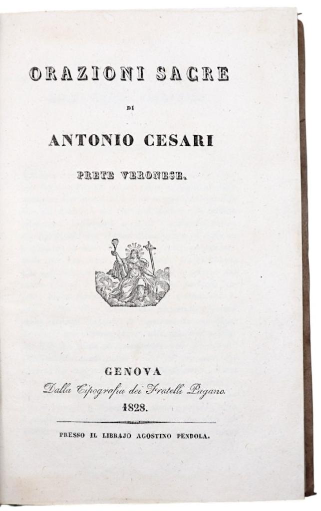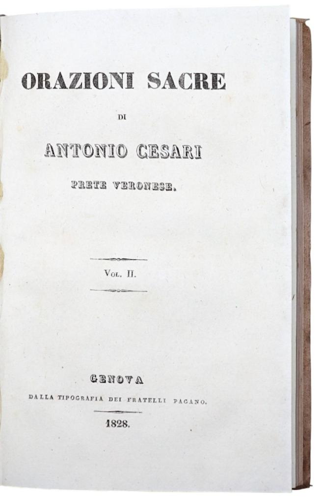 Bella edizione completa in quattro volumi delle celebri Orazioni sacre di Antonio Cesari (1760–1828), sacerdote, letterato e riformatore linguistico veronese, tra i maggiori esponenti del purismo italiano.