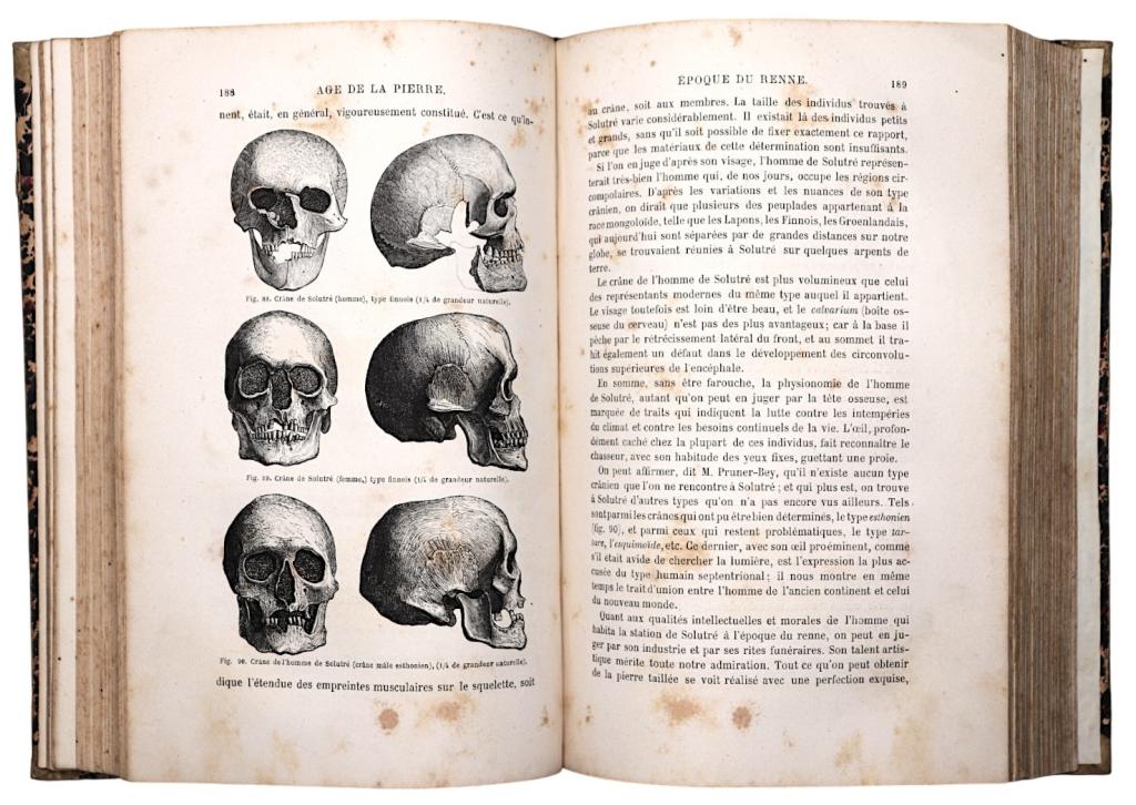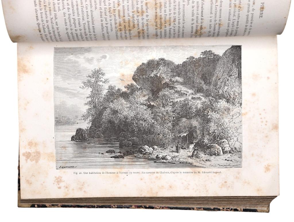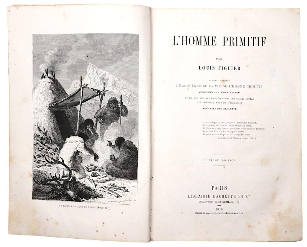 Ouvrage illustré de 30 scènes de la vie de l’homme primitif composées par Émile Bayard, et de 232 figures représentant les objets usuels des premiers âges de l’humanité dessinées par Delahaye.