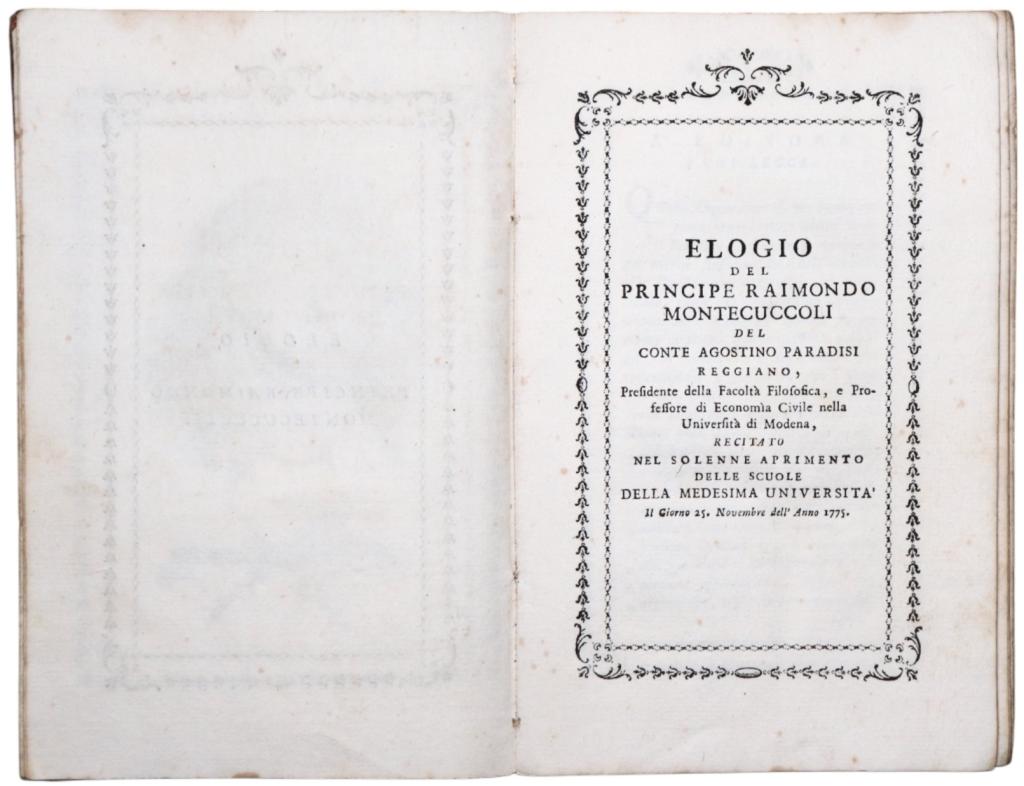 Elogio scritto da Agostino Paradisi e stampato a Bologna nel 1776 da Lelio dalla Volpe, in prima edizione. Il volume è corredato da ritratto inciso di Montecuccoli in antiporta e presenta testo entro cornici tipografiche. Preziose le due vignette incise su rame intercalate nel testo.