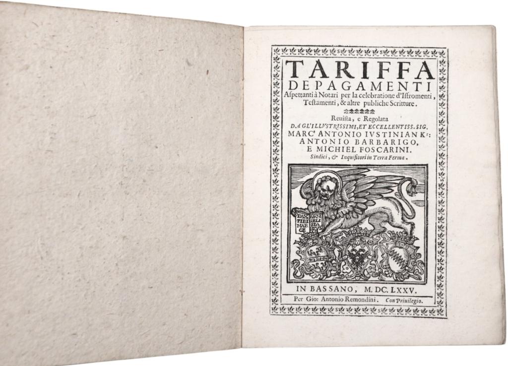 Il volume riveste notevole interesse storico-giuridico e istituzionale. Le tariffe notarili costituiscono una fonte primaria per lo studio dell’amministrazione della giustizia, della prassi notarile e dell’economia quotidiana nella Repubblica di Venezia del XVII secolo, in particolare nei territori di Terraferma. Testi come questo erano strumenti di lavoro indispensabili per notai, cancellieri e magistrati, e per loro natura furono spesso soggetti a uso intenso, rendendo oggi non comuni gli esemplari completi e ben conservati.