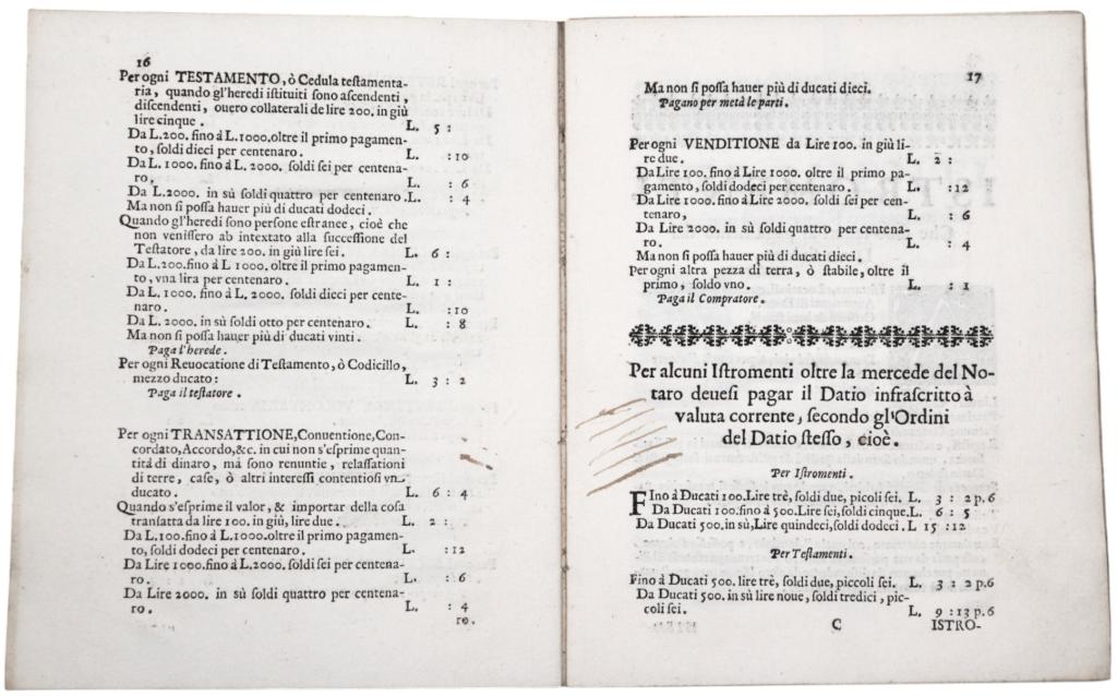 -“Tariffa de pagamenti aspettanti a’ Notari per la celebratione d’istrumenti, testamenti, & altre publiche scritture”, Pagine 23.
