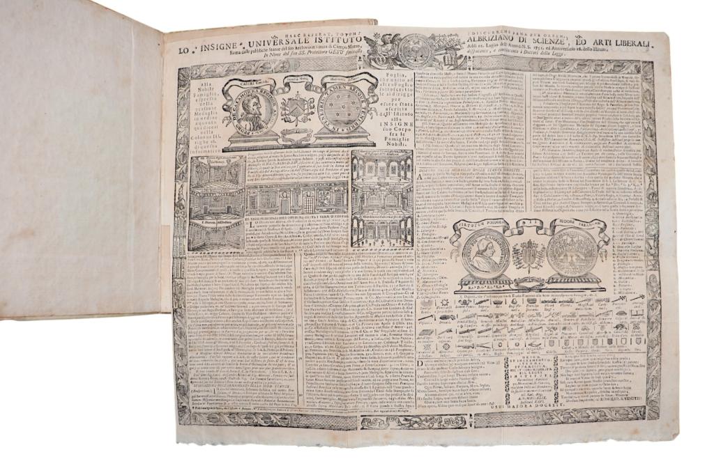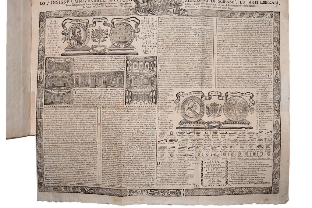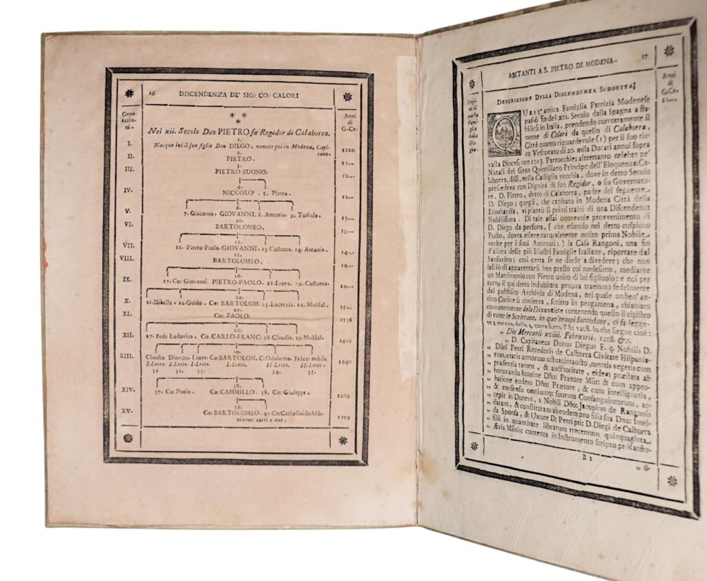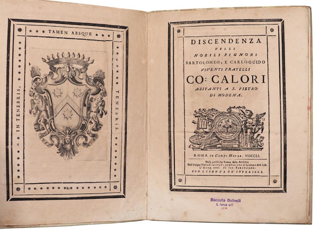 Opera genealogica dedicata alla ricostruzione della discendenza della famiglia Calori di Modena, con particolare riferimento ai fratelli Bartolomeo e Carlo-Guido, abitanti in San Pietro di Modena. Il testo si inserisce nella tradizione settecentesca delle genealogie nobiliari a stampa, spesso prodotte in tiratura limitata e destinate a un ambito familiare o istituzionale. Frontespizio ornato da complessa vignetta simbolica di carattere allegorico-accademico. Esemplare con carta genealogica ripiegata, come da collazione. Rilegatura in piena pergamena. Opera rara.