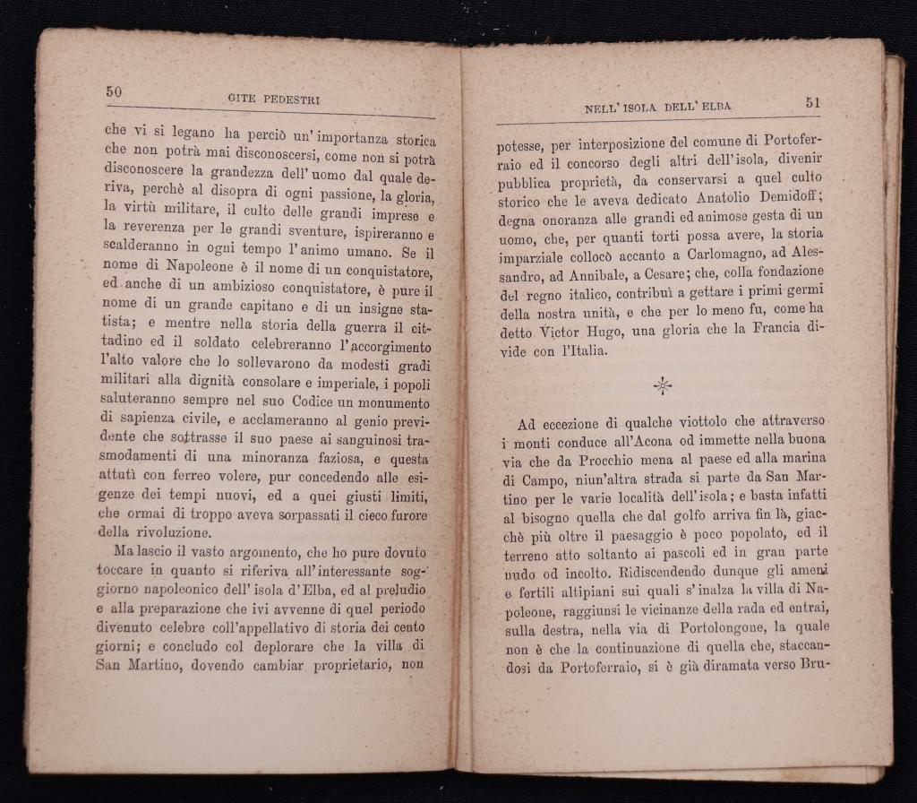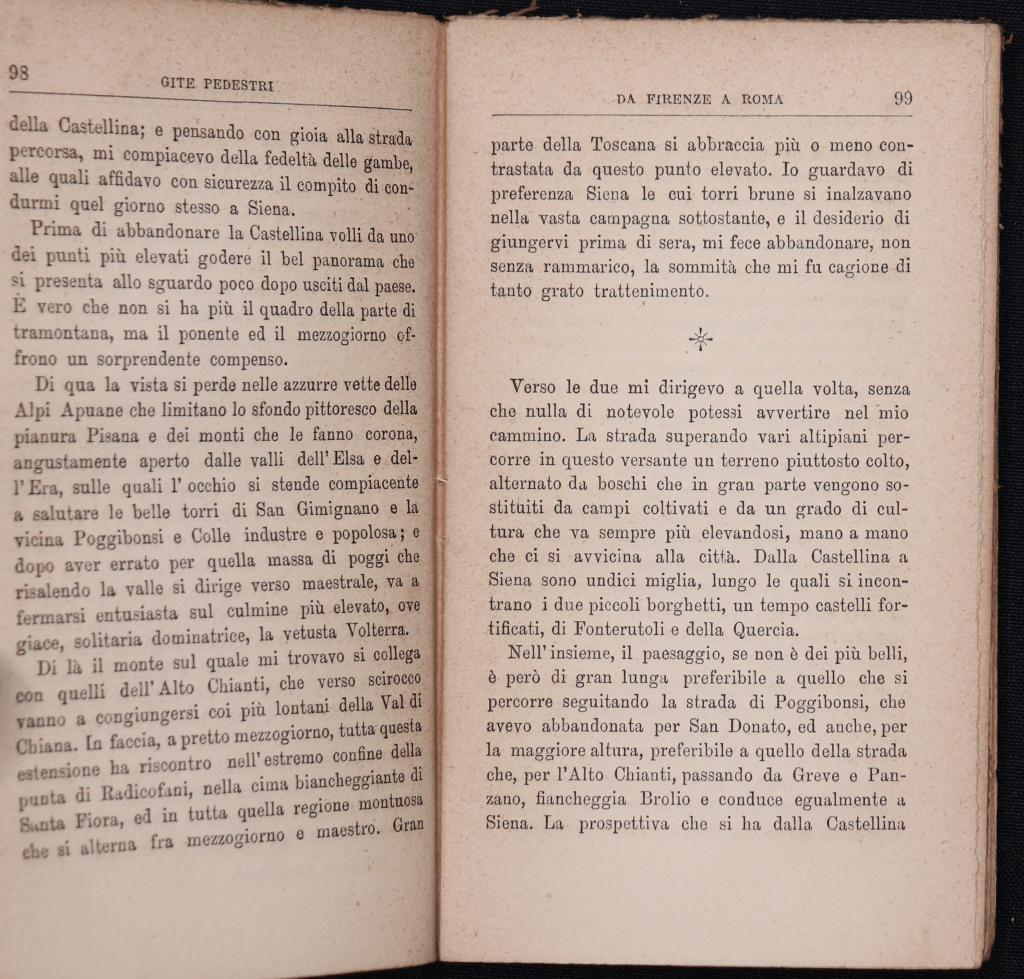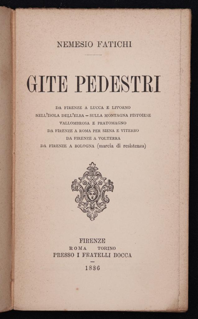 Opera di viaggi e escursioni a piedi pubblicata a Firenze presso i Fratelli Bocca nel 1886. Il volume raccoglie itinerari pedestri che si snodano da Firenze a Lucca e Livorno, nell’Isola d’Elba, sulla montagna pistoiese, a Vallombrosa e Pratomagno, da Firenze a Roma passando per Siena e Viterbo, da Firenze a Volterra e fino a Bologna (marcia di resistenza). Pubblicato in brossura editoriale tipica dell’epoca; presenta il testo delle escursioni e delle descrizioni geografiche e paesaggistiche dei vari percorsi.