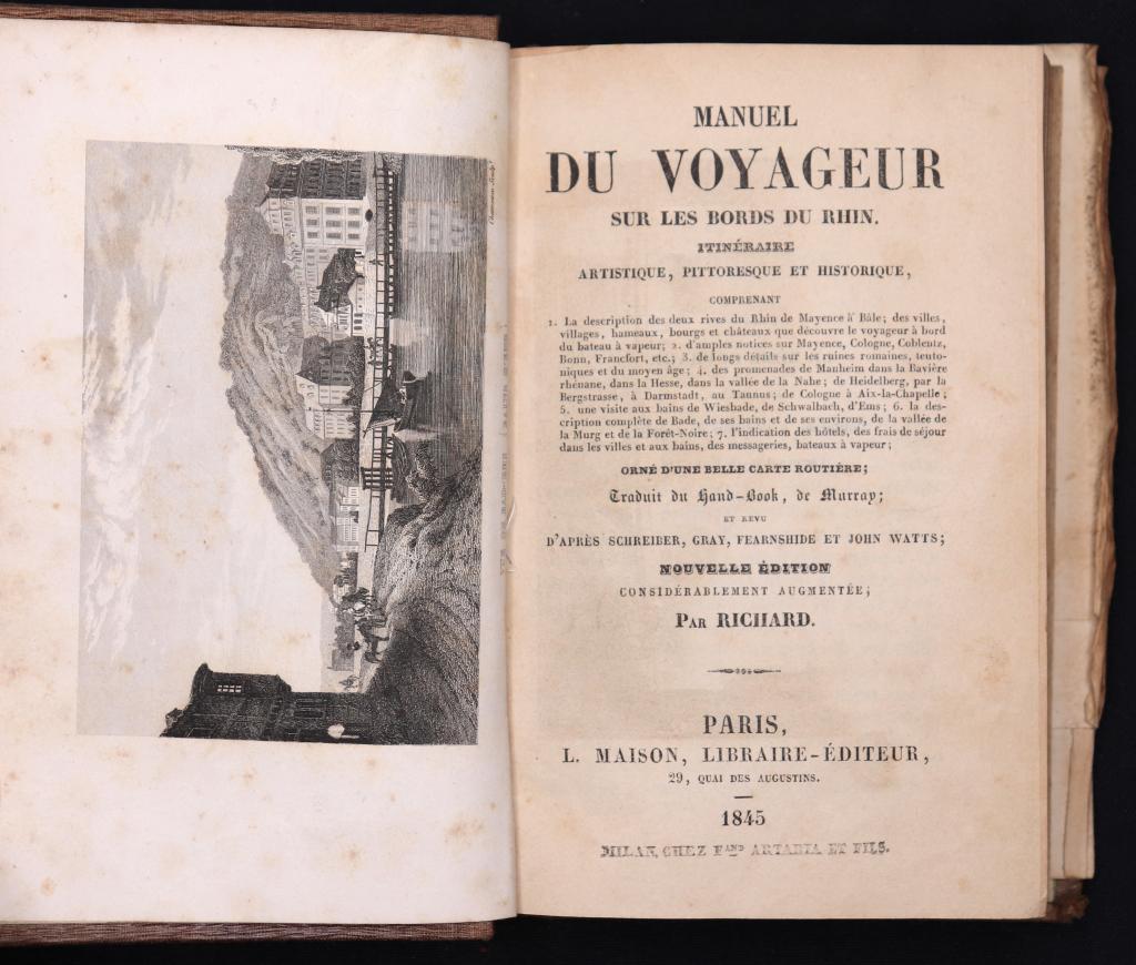Guida di viaggio dedicata ai territori e ai paesaggi lungo le rive del Reno, concepita come manuale per il viaggiatore. Il volume è illustrato da 4 carte fuori testo raffiguranti paesaggi ed è completato da una carta geografica più volte ripiegata posta in fine al testo, elemento di particolare interesse per lo studio storico della geografia e dell’immaginario di viaggio ottocentesco legato all’area renana.