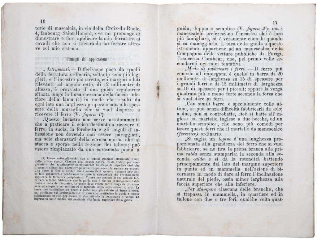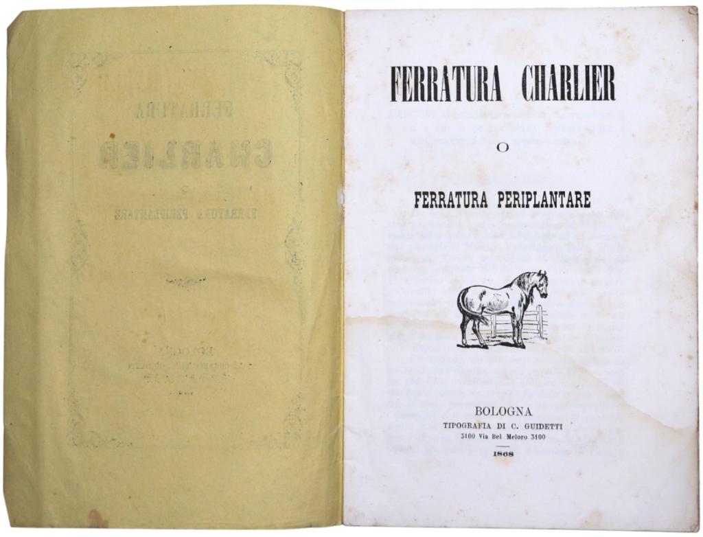 Opuscolo tecnico dedicato al metodo di ferratura Charlier, sistema innovativo di ferratura periplantare diffuso nella seconda metà dell’Ottocento in ambito veterinario e maniscalco, volto a ridurre l’impatto del ferro sull’unghia del cavallo e a migliorarne la funzionalità naturale. Testimonianza significativa della sperimentazione ottocentesca sulle pratiche di mascalcia e sulla fisiologia del piede equino.