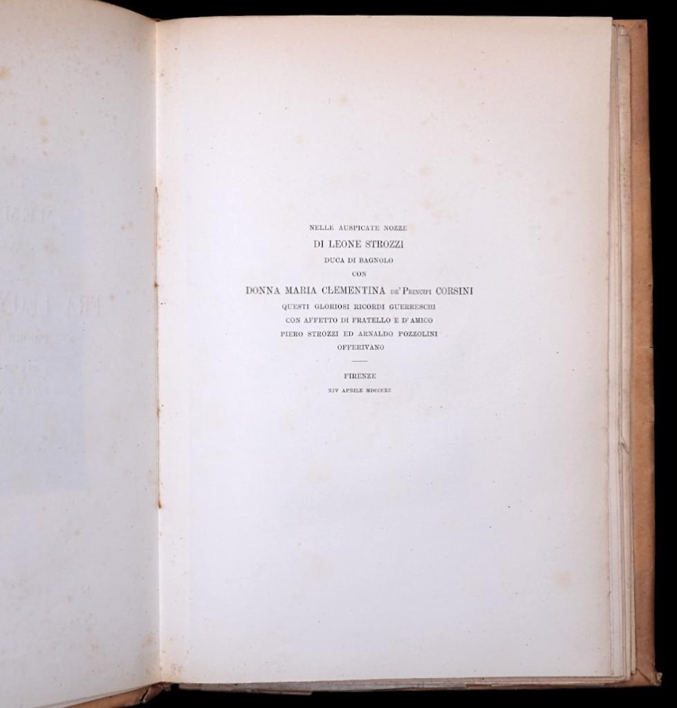 Pubblicazione per nozze, datata Firenze, 14 aprile 1890, dedicata alla figura di Fra Leone Strozzi, Priore di Capua, presentata come “per la prima volta pubblicate con note e documenti inediti” e stampata “nelle auspicate nozze di Leone Strozzi Duca di Bagnolo con Donna Maria Clementina de’ Principi Corsini”. Il volume, comprende un ritratto e una tavola numismatica fuori testo, ed è descritto in legatura editoriale in brossura ricoperta da finta pergamena con stemma della famiglia Strozzi al piatto anteriore. L’edizione è a tiratura limitata di 300 esemplari.