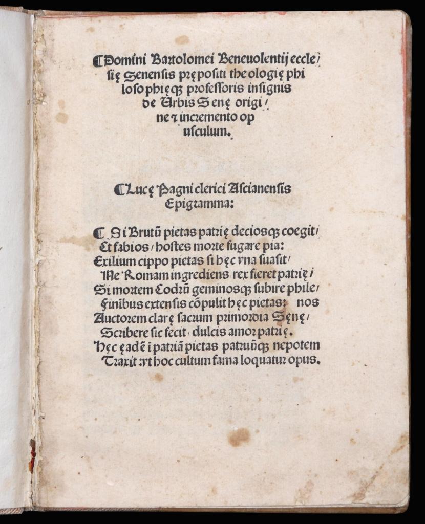 Opuscolo in latino stampato a Siena il 24 dicembre 1506, dedicato all’origine e all’incremento della città (“De urbis Senae origine et incremento”). Il testo è attribuito a Bartolomeo Benvoglienti, preposto della Chiesa senese e indicato come professore di teologia e filosofia, e si presenta come trattazione breve e concentrata di argomento storico-civico, rivolta a fissare e trasmettere una narrazione delle origini della città e delle sue fasi di crescita.